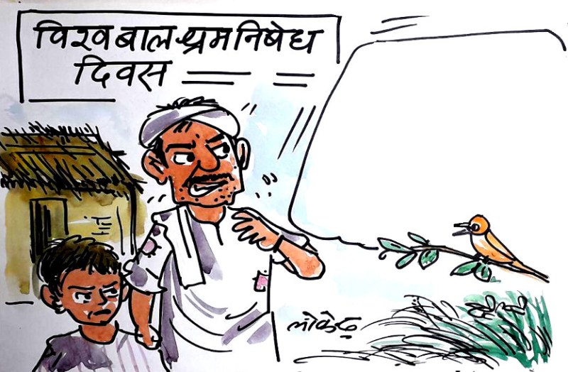 बच्चे को मजदूरी के लिए भेजने वाले एक पिता को क्या सीख दे रही है चिड़िया ?, देखिए कार्टूनिस्ट लोकेन्द्र की नजर से