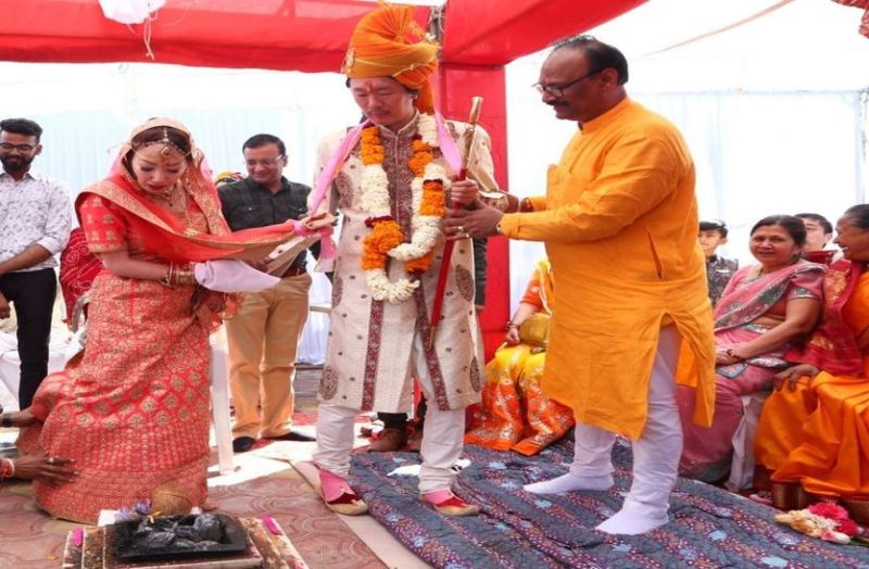 जोधपुर. विश्व जहां विभिन्न समस्याओं से त्रस्त और ग्रस्त है वहीं भारतीय जीवन शैली समूचे विश्व समुदाय को आकर्षित कर रही है। विश्व के अग्रणी और विकसित देश जापान के युगल ने विवाह के लिए भारत में जोधपुर शहर का चयन किया और विधिवत मुहूर्त के बाद अग्नि के समक्ष सात फेरे लेकर जीवन साथी बने। हिन्दू रीति रिवाज से हुए विवाह समारोह में दूल्हे काजूकी ने दुल्हन केको के साथ फेरे लिए। घराती बने जोधपुर निवासी वीरेन्द्र मंजू भंडारी ने बारातियों का पुष्पवर्षा कर स्वागत किया। भारतीय वैदिक सनातन संस्कारों से प्रभावित होकर जापान में ट्रांसपोर्ट व्यवसाय से जुड़े काजूकी और केको ने भारत में विवाह का मानस बनाया।