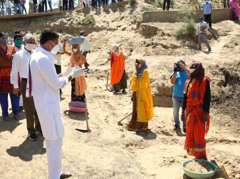 उप मुख्यमंत्री सचिन पायलट ने बुधवार को पंचायत समिति चाकसू, जिला जयपुर की ग्राम पंचायत कुम्हारियावास एवं तितरिया में मनरेगा के तहत चल रहे मॉडल तालाब निर्माण कार्यों का निरीक्षण कर व्यवस्थाओं का जायजा लिया। पायलट ने लॉक डाउन की पालना कराते हुए सोश्यल डिस्टेंसिंग रखने के निर्देश दिए। पिछले चार दिनों में मनरेगा में श्रमिकों की संख्या में 10 गुना बढ़ोतरी हुई है। श्रमिकों की संख्या 62 हजार से बढ़कर 6.08 लाख पहुंच गई है।
