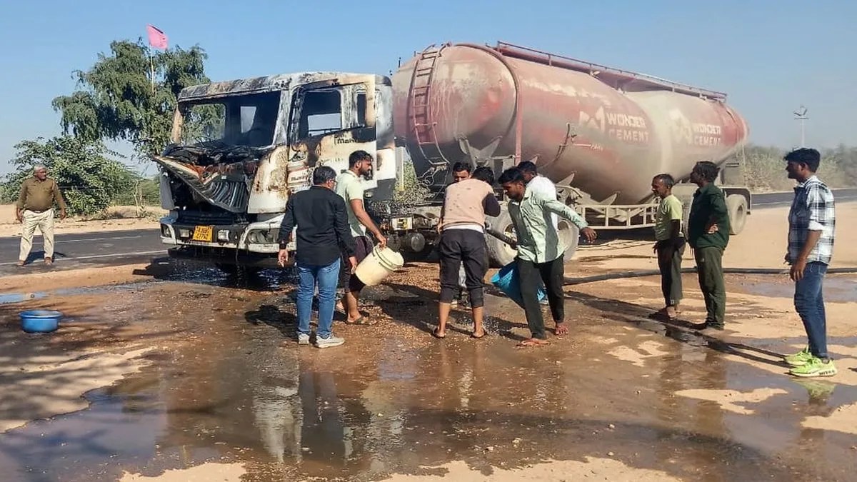 टैंकर के चालक बूंदी जिलांतर्गत हिंडोली तहसील के बसौली थानाक्षेत्र के खिनिया निवासी ओमप्रकाश पुत्र लादूलाल होटल में खाना खाकर टैंकर के केबिन में सो गया। इस दौरान केबिन में अचानक आग लग गई। आग लगने पर चालक की समय पर जाग हो गई और उसने कूदकर अपनी जान बचाई। आग से एकबारगी आसपास अफरा-तफरी मच गई। होटल के संचालक शिवप्रताप व यहां खड़े लोगों ने पास ही स्थित नलकूप को चालू किया और पानी डालकर केबिन में लगी आग पर काबू किया। सूचना पर लाठी थाने के सहायक उपनिरीक्षक किशनसिंह, कांस्टेबल प्रदीपकुमार, बद्रीनारायण घटनास्थल पहुंचे और मौका मुआयना किया। सहायक उपनिरीक्षक किशनसिंह ने बताया कि टैंकर में सीमेंट का पाउडर भरा हुआ था, जो चित्तौड़ के निंबाहेड़ा से जैसलमेर के पारेवर ले जाया जा रहा था। हालांकि समय रहते आग पर काबू कर लिए जाने से बड़ा हादसा टल गया, लेकिन आग से टैंकर का केबिन जल गया।