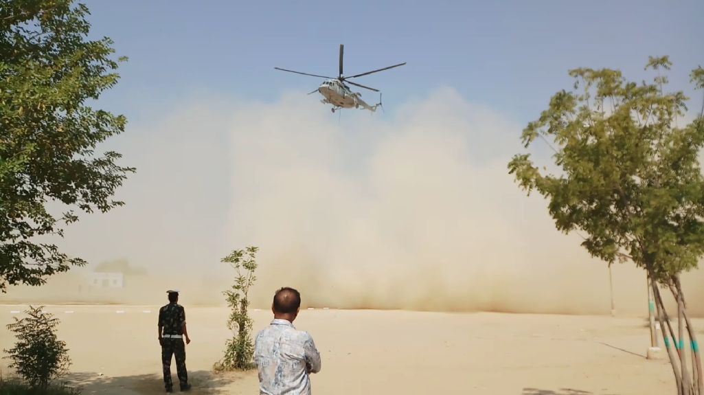 मोहनगढ़. कस्बे के जवाहर नवोदय विद्यालय के खेल मैदान में एक हेलिकॉप्टर का उतरना ग्रामीणों में कौतूहल का विषय बना रहा। हेलिकॉप्टर के उतरने के दौरान चारों तरफ रेत का गुब्बार छाया रहा। इस वजह से बाहर से सडक़ पर चलने वाले वाहनों के चालकों सडक़ भी नजर नहीं आ रही थी, वहीं हेलिकॉप्टर को देखने के लिए विद्यालय की चारदीवारी के बाहर व सडक़ पर ग्रामीणों की भीड़ लगी रही। जवाहर नवोदय विद्यालय में पीटीसी बैठक में भाग लेने पहुंचे अभिभावक भी वहां पहुंच गए। जानकारी के अनुसार वायु सेना के हेलिकॉप्टर द्वारा जवाहर नवोदय विद्यालय के खेल मैदान में उतरने के बाद वायु सैनिकों द्वारा पानी ले जाने के लिए बकेट को जोड़ा जा रहा है। बकेट जोडऩे के बाद हेलिकॉप्टर यहां से वापिस उड़ाने भरता है। उसके बाद आरसीपी कॉलोनी के पास स्थित बाड़मेर जैसलमेर जल प्रदाय परियोजना की डिग्गी से पानी भर कर चांदन फिल्ड फायरिंग के लिए ले जाया जाता है, जहां आग बुझाने का पूर्वा यास किया जा रहा रहा है। नवोदय विद्यालय में हेलिकॉप्टर के उतरने के बाद कई ग्रामीण दूर से ही हेलिकॉप्टर के साथ सेल्फी लेते नजर आए।
