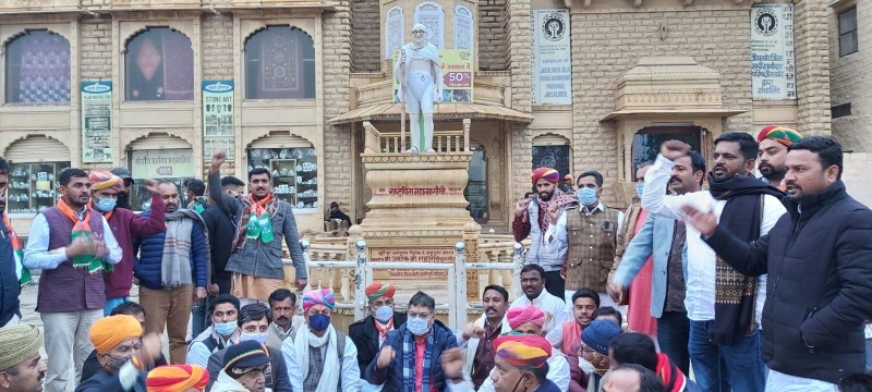 जैसलमेर। प्रधानमंत्री नरेंद्र मोदी की पंजाब यात्रा के दौरान सुरक्षा में चूक के मामले को लेकर भारतीय जनता पार्टी ने शुक्रवार को जैसलमेर के हनुमान चौराहा स्थित गांधी प्रतिमा के सामने बैठ कर धरना दिया और कांग्रेस सहित पंजाब सरकार व कांग्रेस नेताओं के खिलाफ जमकर नारेबाजी की। इस धरने पर जैसलमेर की यात्रा पर आए भाजपा प्रदेश अध्यक्ष सतीश पूनिया भी बैठे और उन्होंने नारेबाजी में साथ बैठे कार्यकर्ताओं की अगुआई की। गौरतलब है कि पंजाब में घटित घटना के विरोध में भाजपा ने शुक्रवार को प्रदेश भर में गांधी प्रतिमाओं के सामने धरने आयोजित किए। इसकी कड़ी में जैसलमेर में धरना दिया गया। धरनास्थल पर भाजपा जिलाध्यक्ष चंद्रप्रकाश शारदा, जिला प्रमुख प्रतापसिंह सोलंकी, पूर्व विधायक छोटूसिंह भाटी और शैतानसिंह राठौड़, पार्टी नेता विक्रमसिंह नाचना, आईदानसिंह भाटी, उदयसिंह बडोड़ागांव, जुगल बोहरा, कंवराजसिंह चौहान, हिम्मताराम चौधरी, अरुण पुरोहित, अजय व्यास, हरिसिंह डांगरी आदि उपस्थित थे।