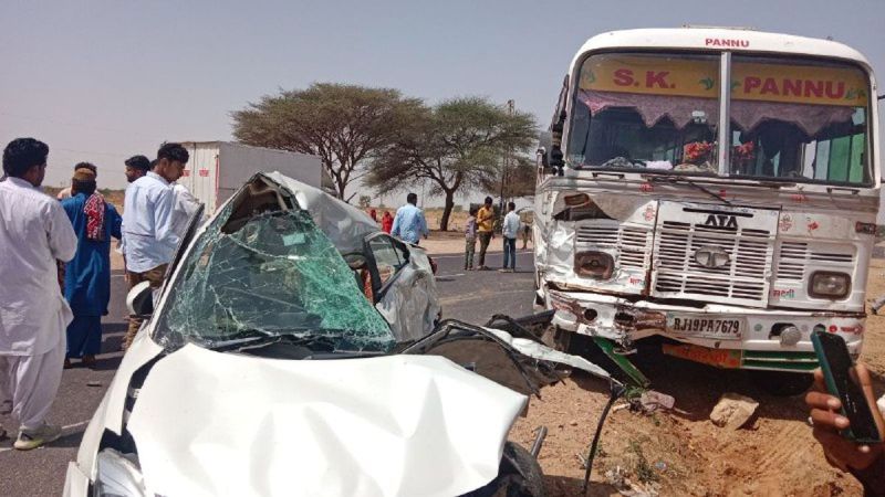 जैसलमेर जिले के भागू का गांव फांटा के पास बुधवार को एक बस और कार के बीच भिडं़त में एक व्यक्ति की मौत हो गई, जबकि 3 लोग घायल हो गए। मृतक व घायल सभी कार में सवार थे। हादसा होने पर मौके पर बड़ी संख्या में लोग जमा हो गए। उन्होंने घायलों कार से बाहर निकालने में मदद की और जैसलमेर अस्पताल पहुंचवाया। जिला अस्पताल में भी घायलों के पहुंचने पर काफी भीड़ जमा हो गई। चिकित्सकीय टीम ने घायलों का उपचार शुरू किया। सदर थाना पुलिस के एएसआइ मुकेश बीरा ने बताया कि हादसे में नूर खां (40) पुत्र पीराणे खां, निवासी घुरिया की मौत हो गई, वहीं घायलों में समीर पुत्र फतेह खां, निवासी बाकासर, शिव, हाजी खां पुत्र गुलाम खां, निवासी कुछड़ी और ईशे खां पुत्र अब्दुल्लाह, निवासी इसरोल, चौहटन शामिल हैं। मृतक के शव का पोस्टमार्टम करवाने के बाद पुलिस ने परिवारजनों को सौंप दिया। हादसे में कार का अगला हिस्सा पूरी तरह से क्षतिग्रस्त हो गया, जबकि बस को भी नुकसान पहुंचा।