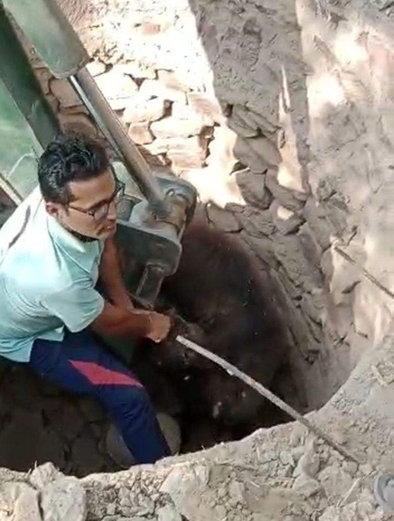 लाठी. क्षेत्र के गंगाराम की ढाणी के पास जंगल में 20 फीट गहरे टांके में गिरने ऊंट के बच्चे को सेना के जवानों ने ग्रामीणों की सहायता से 3 घंटे मशक्कत कर बाहर निकाला। गंगाराम की ढाणी के पास जंगल में वर्षों पुराना टांका निर्मित है। जिसकी गहराई करीब 20 फीट है। इस टांके पर ढक्कन नहीं होने के कारण यह खुला पड़ा है और आए इसमें पशु गिरकर चोटिल हो रहे है। कुछ दिन पूर्व पानी की तलाश में ऊंट का एक बच्चा उसमें गिर गया। सूचना पर श्रवण पूनिया, राकेश गोदारा सहित ग्रामीण एकत्रित हुए, लेकिन टांके की छत होने के कारण बछड़े को निकालना मुश्किल हो रहा था। यहां पास ही सेना की यूनिट थी, जिसे सूचना दी गई। जवानों ने जेसीबी की सहायता से टांके की छत को तोड़कर करीब 3 घंटे की मशक्कत कर ऊंट के बच्चे को बाहर निकाला। इसके बाद प्राथमिक उपचार करवाकर जंगल में छोड़ दिया।