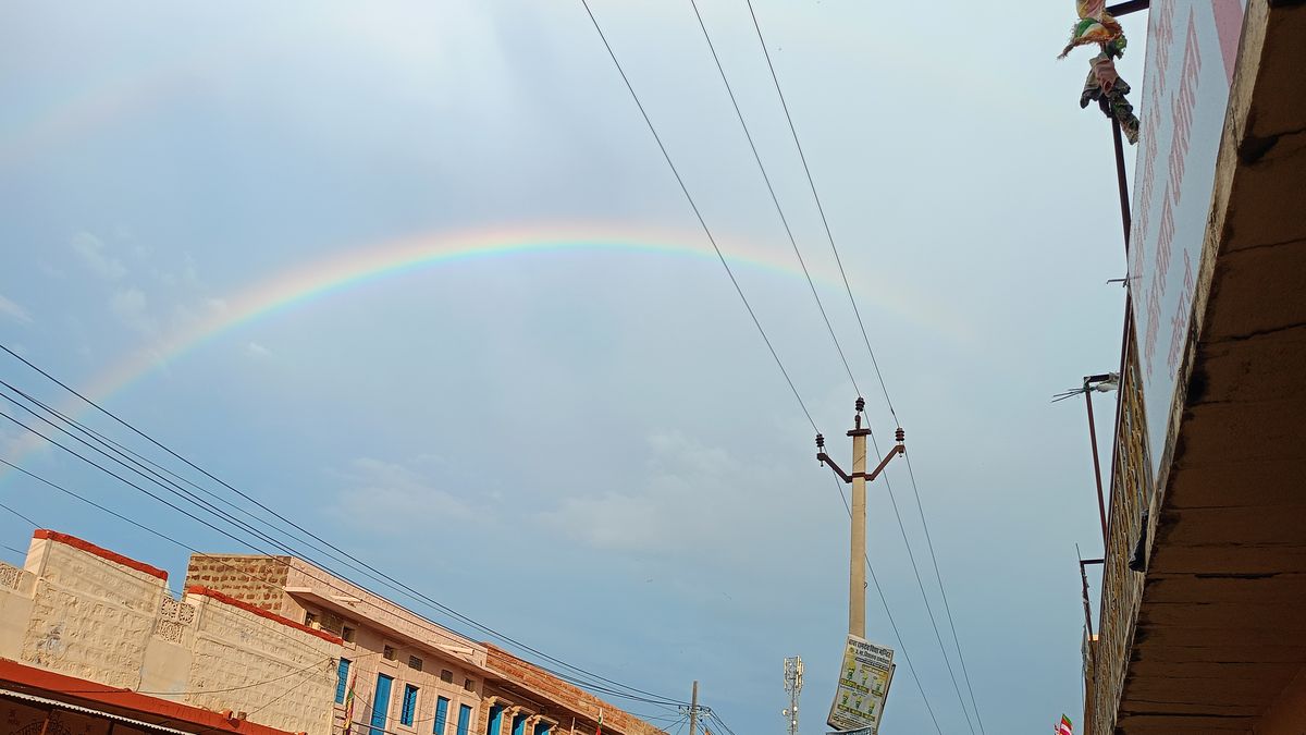 रामदेवरा. शुक्रवार को हुई बारिश के दौरान आकाश में बने इंद्रधनुष का नजारा।