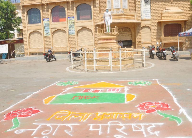 जैसलमेर. नगरपरिषद जैसलमेर की ओर से चलाए जा रहे कोरोना जागरूकता विशेष अभियान के तहत गुरुवार को शहर में गोपा चौक व हनुमान चौराहा पर रंगोली का कार्यक्रम आयोजित किया गया। स्वयं सहायता समूह की महिलाओं ने कोरोना में उपचार ही बचाव को लेकर रंगोली उकेरी गई एवं इन रंगोली के माध्यम से लोगों को मास्क पहननें का संदेश दिया गया। इसी तरह सोशल डिस्टेंसिंग एवं बार.बार हाथ धोने का भी संदेश दिया गया। रंगोली को लोगों ने देखा एवं इससे प्रेरणा भी ली।