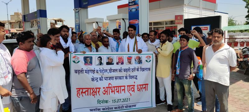 पोकरण. देशभर में बढ़ती पेट्रोल, डीजल व रसोई गैस की कीमतों के विरोध में कांग्रेस की ओर से किए जा रहे विरोध के अंतर्गत गुरुवार को कस्बे में पोकरण व सांकड़ा ब्लॉक कांग्रेस की ओर से भी प्रदर्शन किया गया तथा हस्ताक्षर अभियान चलाया गया। कांग्रेस के वरिष्ठ नेता अब्दुला फकीर के नेतृत्व में ब्लॉक कांग्रेस अध्यक्ष राजेन्द्र पुरोहित, चेतनराम मेघवाल, नगरपालिका में नेता प्रतिपक्ष नारायणलाल रंगा, एनएसयूआई के जिलाध्यक्ष भोमसिंह भणियाणा, हेमंत पालीवाल, हरिवंश व्यास, हबीबखां बरियाड़ा, नारायण शर्मा, महेश पुरोहित, गोपाल जोशी सहित बड़ी संख्या में कार्यकर्ता गुरुवार को सुबह मुख्य चौराहे पर एकत्रित हुए। यहां उन्होंने जमकर नारेबाजी की तथा महंगाई के विरोध में प्रदर्शन किया। इसके बाद मुख्य चौराहे के पास स्थित पेट्रोलपंप पर जाकर विरोध प्रदर्शन किया गया। यहां कार्यकर्ताओं की ओर से हस्ताक्षर अभियान चलाकर महंगाई के विरोध में राष्ट्रपति के नाम ज्ञापन प्रेषित किया गया। इस मौके पर संबोधित करते हुए कांग्रेस नेता अब्दुला फकीर ने बताया कि गत सात वर्षों से महंगाई अप्रत्याशित रूप से लगातार बढ़ रही है। जिसका सर्वाधिक भार किसान, मजदूर, गरीब वर्ग पर पड़ रहा हैै। पेट्रोल, डीजल व रसोई गैस की कीमतें बढऩे के कारण प्रत्येक वस्तु महंगी हो गई है और गरीब व मध्यम वर्ग के परिवार को कई परेशानियों से रूबरू होना पड़ रहा है। उन्होंने बताया कि महंगाई को लेकर प्रदेश कांग्रेस के निर्देशानुसार प्रदेशभर में विरोध प्रदर्शन किया जा रहा है, लेकिन केन्द्र सरकार कोई ध्यान नहीं दे रही है। ब्लॉक कांग्रेस अध्यक्ष राजेन्द्र पुरोहित ने बताया कि कांग्रेस सरकार के समय कच्चे तेल के दाम बढऩे के बावजूद पेट्रोल डीजल की कीमतें नहीं बढ़ाई गई। जबकि अब कच्चे तेल के दाम कम होने के बावजूद पेट्रोल डीजल के भावों को कम नहीं किया जा रहा है। जिसका भार आम जनता पर पड़ रहा है तथा उन्हें परेशानी हो रही है। उन्होंने बताया कि जब तक महंगाई कम नहीं होती है, तब तक कांग्रेस का आंदोलन जारी रहेगा।