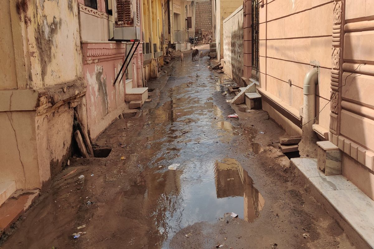पोकरण कस्बे के एको की प्रोल से गांधी चौक जाने वाले मार्ग पर आए दिन नालियों से गंदा पानी ओवरफ्लो होकर सड़क पर जमा हो रहा है। इसके साथ ही रविवार को जलदाय विभाग की पाइपलाइन भी लीकेज हो गई, जिसके कारण कीचड़ व गंदगी बढ़ गई। जिससे दिनभर राहगीरों व वाहन चालकों को आवागमन में परेशानी हुई। ऐसे में यहां निवास कर रहे लोगों का घरों से निकलना मुश्किल हो गया। जानकारी के अनुसार एको की प्रोल से गांधी चौक जाने वाले मार्ग पर सड़क के दोनों तरफ घनी आबादी निवास करती है। यहां गंदे पानी की निकासी के लिए नालियां निर्मित है, लेकिन लंबे समय से इन नालियों की सफाई नहीं होने के कारण कचरा व गंदगी जमा है, जिससे आए दिन गंदा पानी ओवरफ्लो होकर सड़क पर बहने लगता है। इस दौरान आसपास निवास कर रहे लोगों का घरों से निकलना मुश्किल हो जाता है तो राहगीरों व वाहन चालकों का यहां से गुजरना दुश्वार। जिससे उन्हें परेशानी हो रही है।