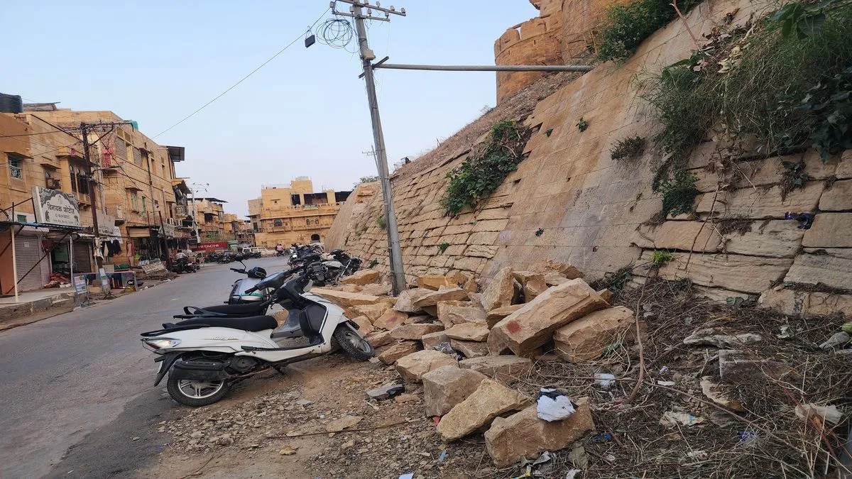 स्वर्णनगरी में सोनार दुर्ग की दीवार की मरम्मत कार्य कछुआ चाल से चलने के कारण गोपा चौक-शिव मार्ग पर अव्यवस्था गहराती जा रही है। करीब दो वर्ष पहले दुर्ग की दीवार क्षतिग्रस्त हुई थी, जिसके बाद मरम्मत कार्य शुरू किया गया। समय बीतने के बावजूद कार्य पूरी तरह व्यवस्थित नहीं हो सका है। जिस हिस्से की दीवार को दुरुस्त किया जा चुका है, वहां अब भी पत्थर और निर्माण सामग्री पड़ी है। लगभग 40 फुट तक लोहे के पतरे लगे होने से मार्ग संकरा हो गया है और यातायात व्यवस्था रामभरोसे चल रही है।