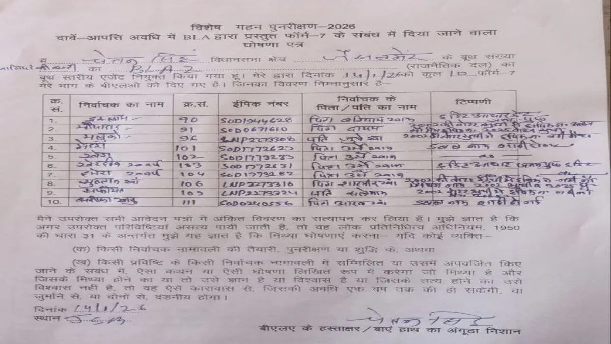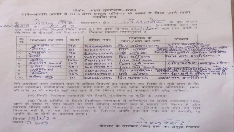 एसआइआर के प्रारूप प्रकाशन के बाद नाम कटवाने के लिए प्रपत्र-7 दिया जाता है। इसमें मतदाता सूची में किसी नाम को शामिल करने पर आपत्ति जताई जाती है या नाम को हटाने के लिए भरा जाता है। प्रपत्र-7 केवल वही व्यक्ति दे सकता है, जिसका नाम उस निर्वाचन क्षेत्र की मतदाता सूची में दर्ज है। साथ ही बीएलए-2 एक दिन में अधिकतम 10 आवेदन कर सकता है। इसके लिए शपथ पत्र भी देना पड़ता है।