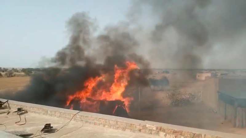 लाठी. क्षेत्र के भैरवा गांव के पास एक ढाणी में स्थित झोंपे में शनिवार देर शाम अचानक लगी आग से गैस टंकी में विस्फोट हो गया। जबकि पशुबाड़ा व चारा जलकर नष्ट हो गया। करीब दो घंटे की मशक्कत कर आग पर काबू किया गया। भैरवा गांव के पास स्थित अगरसिंह की ढाणी में शनिवार देर शाम अज्ञात कारणों से झोंपे में आग लग गई। देखते ही देखते आग ने पूरे झोंपे को अपनी चपेट में ले लिया तथा झोंपा धूं-धूं कर जलने लगा। आग से झोंपे में रखी गैस की टंकी में अचानक विस्फोट हो गया। जिससे आग ने जोर पकड़ लिया और लपटें ऊपर उठने लगी। टंकी में विस्फोट के कारण अवशेष पास स्थित बाड़े व चारे में जाकर गिरे। जिससे उसमें भी आग लग गई। आग के विकराल रूप, ऊंची लपटें व धुंआ देखकर आस पड़ौस से ग्रामीण एकत्रित हुए। सूचना पर जैसलमेर से दमकल मौके पर पहुंची तथा ग्रामीणों की सहायता से दो घंटे की मशक्कत कर आग पर काबू किया गया। आग से झोंपा, पांच बोरी जीरा, आठ बोरी रायड़ा, आठ बोरी चना, आठ बोरी सरसों, पांच बोरी गेहूं, पशुचारा आदि जलकर नष्ट हो गया।
