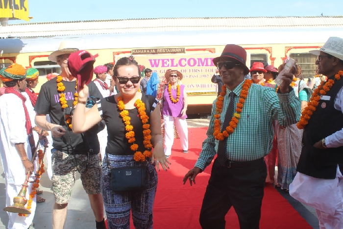 जैसलमेर. शाही अंदाज में आधुनिक सुख-सुविधाओं से युक्त पैलेस ऑन व्हील्स जब रविवार को पहले फेरे के दौरान जैसलमेर रेलवे स्टेशन पर पहुंची तो यहां पहुंचे सैलानी लोक कलाकारों के वाद्य यंत्रों की धुनों पर थिरक उठे। मरूधरा की संस्कृति में रंगे पर्यटकों को देखकर हर कोई दंग रह गया। रेलवे स्टेशन पर शाही रेल में आए सभी 36 पर्यटकों का परंपरागत रूप से स्वागत किया गया। पांच सितारा होटलों जैसी सुविधाओं से परिपूर्ण शाही रेल ‘पैलेस ऑन व्हील्स’ दिल्ली से गत बुधवार को रवाना हुई थी।