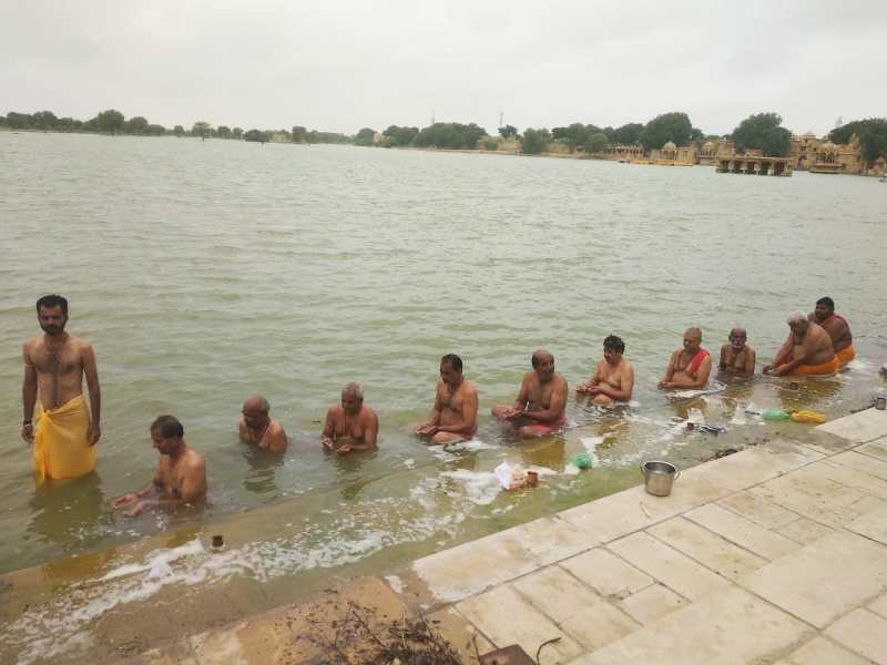 जैसलमेर स्थित गुलाब सागर स्थित रामदेव मंदिर में पवित्र श्राद्धपक्ष में आयोजित पितृ तर्पण कार्यक्रम आश्विन कृष्ण अमावस्या रविवार को दाता उम्मेद गिरी के सानिध्य में पं. अनिल चूरा एवम आनद रामदेव के द्वारा संपन्न हुआ। पं. अनिल चूरा ने बताया कि संयोगवश इस बार पितृ.मोक्ष अमावस्या पर सर्वार्थ सिद्धि, रवि, बुद्धादित्य और कन्या राशि में चतुग्र्रही योग का संयोग रहेगा। अमावस्या के दिन अपने शिष्यों सहित कृष्ण जन्मभूमि निर्माण न्यास मथुरा के राष्ट्रीय सचिव संत दाता स्वामी उम्मेद गिरी की ओर से पितृ तर्पण कार्यक्रम में भाग लेकर अपने पितरों को जलांजलि दी। संत दाता स्वामी ने बताया कि सर्वपितृपक्ष अमावस्या को विसर्जनी अमावस्या भी कहा जाता है। पं. विजय व्यास के सानिध्य में यज्ञ का आयोजन भी किया गया।