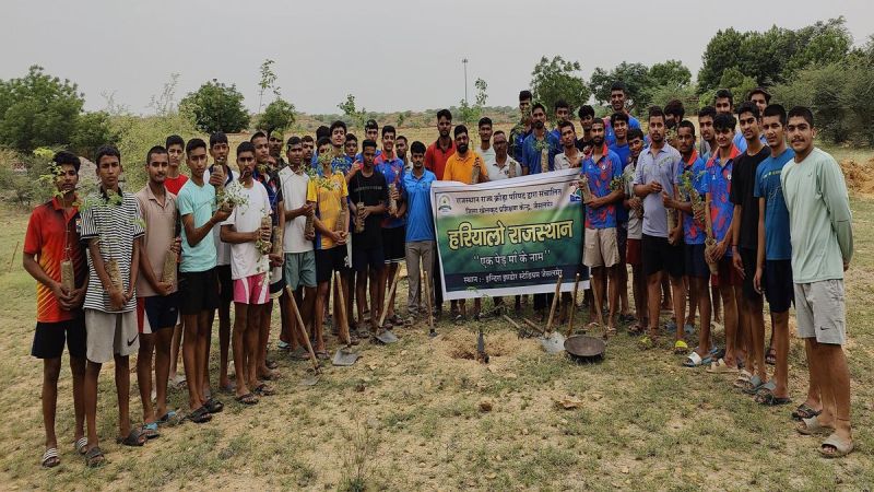 हरियाली तीज के पावन अवसर पर रविवार को मुख्यमंत्री वृक्षारोपण महाभियान- हरियालो राजस्थान के अंतर्गत एक पेड़ मां के नाम कार्यक्रम का आयोजन इंदिरा इंडोर स्टेडियम, खेल परिसर में किया गया। इस अवसर पर बास्केटबॉल एवं हैंडबॉल अकादमी के प्रशिक्षु खिलाड़ियों, जिला खेल केंद्र में नियमित अभ्यासरत खिलाड़ियों तथा प्रतिनियुक्त अल्पकालिक प्रशिक्षकों ने पर्यावरण संरक्षण की शपथ ली और सामूहिक वृक्षारोपण में भाग लिया। जिला खेल अधिकारी राकेश बिश्नोई ने बताया कि राजस्थान राज्य क्रीड़ा परिषद जयपुर व जिला प्रशासन के निर्देशन में नगर परिषद व जिला खेल संघों के सहयोग से खेल परिसर में विभिन्न ब्लॉकों में पौधरोपण किया गया। इस दौरान शीशम, नीम, सरेस, गुलमोहर, रोहिड़ा, करंज, अमलतास, पीपल, बड़, खेजड़ी, इमली, कनेर, नागचंपा, बोगनवेलिया सहित औषधीय व छायादार पौधे तथा फलदार प्रजातियों में जामुन, अमरूद, अनार, चीकू, आम, पपीता, आंवला, केला, खजूर व नींबू के कुल 2100 पौधे रोपे गए।