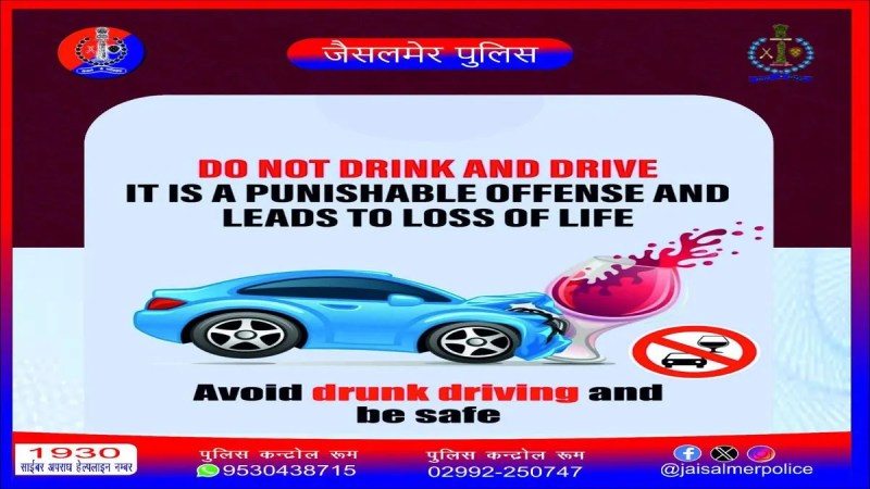 पर्यटन सीजन के चरम पर पहुंचने के साथ ही जिले में बढ़ते यातायात दबाव को देखते हुए जैसलमेर पुलिस ने आमजन एवं पर्यटकों से यातायात नियमों की सख्ती से पालना करने की अपील की है। जिला पुलिस ने स्पष्ट किया है कि शराब का सेवन कर वाहन चलाना न केवल दंडनीय अपराध है, बल्कि यह स्वयं और दूसरों के जीवन के लिए भी गंभीर खतरा बन सकता है।जैसलमेर पुलिस की ओर से जारी जागरूकता संदेश में कहा गया है कि ड्रिंक एंड ड्राइव की घटनाएं सड़क हादसों का बड़ा कारण बनती हैं, जिससे जानमाल की भारी क्षति होती है। ऐसे मामलों में कानून के तहत कड़ी कार्रवाई की जाती है। पुलिस ने पर्यटक सीजन के दौरान जिले में किए जा रहे यातायात प्रबंधन में आमजन के सहयोग की अपील करते हुए कहा कि सुरक्षित यात्रा सभी की जिम्मेदारी है। नियमों का पालन कर ही सड़क हादसों को रोका जा सकता है।
