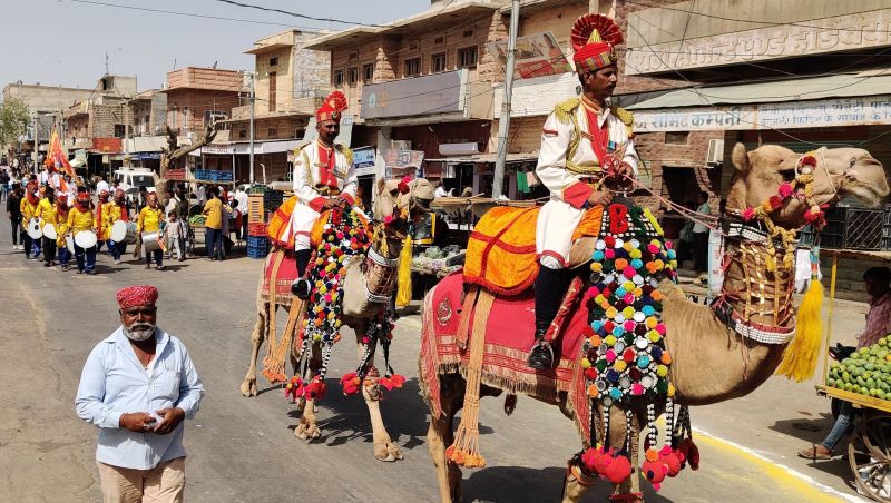 महेश नवमी के मौके पर माहेश्वरी समाज की ओर से माहेश्वरी कटले से एक शोभायात्रा निकाली गई। जिसमें एक वाहन में दुकान में काम करते सेठ की झांकी आकर्षण का केन्द्र रही तथा अन्य वाहनों में भगवान शिव, पार्वती, लोकदेवता बाबा रामदेव की झांकियां सजाई गई थी। इसी प्रकार सबसे आगेे सीमा सुरक्षा बल 87वीं बटालियन के सजे-धजे दो ऊंट, तीन अलग-अलग घोड़ों पर सवार समाज के युवा व युवतियां आकर्षण का केन्द्र रही। शोभायात्रा के दौरान ढोल नगाड़ों पर नाचते गाते युवा तथा समाज के बड़ी संख्या में पुरुष व महिलाएं भजन करते हुए चल रहे थे। यह शोभायात्रा माहेश्वरी न्याति नोहरे से गांधी चौक, फोर्ट रोड, सुभाष चौक, जयनारायण व्यास सर्किल, जोधपुर रोड, अस्पताल रोड, एको की प्रोल, गुराणियों की गली से पुन: गांधी चौक होते हुए माहेश्वरी समाज न्याति नोहरे में पहुंची और समापन किया गया। इस दौरान गांधी चौक में नगरपालिका अध्यक्ष मनीष पुरोहित, पंचायत समिति सांकड़ा के प्रधान भगवतसिंह तंवर, पालिका के पूर्व अध्यक्ष आनंदीलाल गुचिया ने शोभायात्रा में शामिल लोगों का स्वागत व अभिनंदन किया। इसी प्रकार शोभायात्रा के दौरान मुख्य मार्गों पर कस्बेवासियों की ओर से पुष्पवर्षा कर स्वागत किया गया।