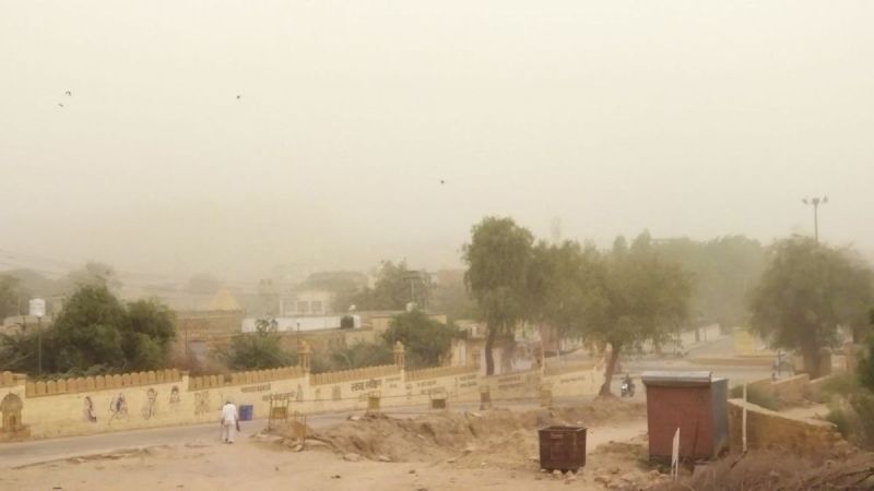 भीषण गर्मी और त्वचा जलाने वाली लू के थपेड़ों से परेशान स्वर्णनगरी के बाशिंदों को बीती रात आए तेज अंधड़ के कारण चारों तरफ रेत ने हैरान किया। रविवार को भी दिनभर आकाश में धूल की गर्द छाई रही, जिससे सूर्यदेव चमक नहीं बिखेर पाए। इसके बावजूद गर्मी के मिजाज में कमी नहीं आई। उमस का वातावरण होने से पंखों व कूलर के आगे बैठे लोगों के भी पसीने छूटते रहे। सडक़ों पर निकले लोगों को चिपचिपाहट व तपिश ने हैरान किया। मौसम विभाग के अनुसार रविवार को अधिकतम तापमान 43.4 और न्यूनतम 31.5 डिग्री सै. रिकॉर्ड किया। जबकि गत दिवस यह क्रमश: 47.0 व 28.4 डिग्री रहा था। इस तरह से अधिकतम तापमान में 3.6 डिग्री की कमी आई और दूसरी ओर न्यूनतम तापमान में 3.1 डिग्री की बढ़ोतरी हो गई। स्वर्णनगरी के बाशिंदे रविवार को सुबह उठे तो उन्हें घर और बाहर हर कहीं चिकनी मिट्टी में सना वातावरण दिखाई दिया। घरों के बाहर खड़े दुपहिया व चार पहिया वाहनों पर रेत की चादर बिछी हुई थी। घरों में साफ-सफाई का काम बढ़ गया। स्वर्णनगरी में दुर्ग की ऊंचाई से देखने पर तलहटी में बसा शहर मानो कोहरे की आगोश में नजर आया। शाम तक भी उमसपूर्ण वातावरण होने से नगरवासियों को पसीने से निजात नहीं मिली।