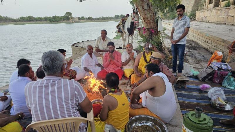 ऐतिहासिक गड़ीसर सरोवर के ऐतिहासिक सावित्री घाट पर सोमवार को बैशाख पूर्णिमा के अवसर पर गायत्री पूजन, वेद मंत्रों से हवन और गड़ीसर सरोवर की आरती के साथ स्वच्छता और नशा मुक्ति का संकल्प लिया गया। आयोजन में च्स्वच्छ गड़ीसर, नशा मुक्त जैसाणज् का नारा गूंजा।.पुरोहित बगेची विकास समिति व नवयुवक मंडल की ओर से आयोजित इस हवन में राष्ट्र की खुशहाली, सैनिकों के मनोबल और पर्यावरण शुद्धि की कामना की गई। गायत्री मंत्र की 108 आहुतियों के साथ पंडित धर्मेंद्र ओझा और पंडित विकास आचार्य के संयोजन में मुख्य यजमान महेन्द्र कल्ला और शुभम पुरोहित ने वैदिक अनुष्ठान पूर्ण कराया।