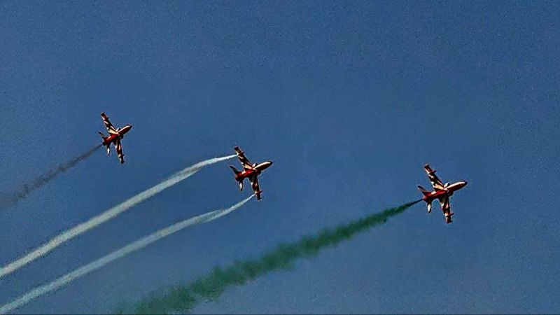 रेगिस्तान की स्वर्णिम धरती पर जब भारतीय वायुसेना की सूर्यकिरण एयरोबेटिक टीम के जांबाजों ने लड़ाकू विमानों के साथ आकाश में कलाबाजियां दिखाई तो मानो पूरा आसमान तिरंगे के रंगों से नहा गया। जैसलमेर का आकाश सोमवार को गौरवमयी करतबों का साक्षी बना, जहां सूर्यकिरण टीम ने अपने साहस, निपुणता और परिश्रम से देशभक्ति का कभी न भूलने वाला समां बांध दिया। टीम के हॉक विमानों की गगनचुंबी उड़ानों और तिरंगे रंगों की धारा ने डेडानसर मैदान में उपस्थित जनसमूह को रोमांचित कर दिया। हर फॉर्मेशन में टीम के विमानों के अद्वितीय सामंजस्य और कलाबाजियों ने दर्शकों को स्तब्ध कर दिया। जैसलमेर के निर्वाचित जनप्रतिनिधि, सैन्य बलों के अधिकारी और आमजन ने इस अद्भुत क्षण को गर्व से निहारा और उन्हें ऐसा महसूस हुआ मानो नीला आकाश स्वयं वीरता का गीत गा रहा हो।