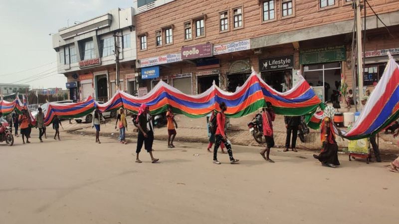 आबूरोड से 251 फीट लंबी ध्वजा लेकर पदयात्री गुरुवार को सुबह पोकरण पहुंचे। गौरतलब है कि इन दिनों रामदेवरा में भादवा मेले के दौरान प्रतिदिन श्रद्धालुओं की भीड़ उमड़ रही है। विभिन्न राज्यों व जिलों से प्रतिदिन सैकड़ों श्रद्धालु पोकरण होकर रामदेवरा की तरफ जाते नजर आ रहे है। ऐसे मेुं रामदेवरा के साथ ही पोकरण में भी मेले जैसा माहौल बना हुआ है। डीजे पर भजनों पर नाचते गाते और जयकारे लगाते श्रद्धालुओं का उत्साह व जोश देखते ही बन रहा है। इन दिनों बाबा के भजनों व जयकारों से पोकरण का वातावरण धर्ममय बना हुआ है। इसी के अंतर्गत गुरुवार को सुबह लंबी ध्वजा लेकर यहां से गुजरते श्रद्धालु आकर्षण का केन्द्र बन गए। जानकारी के अनुसार आबूरोड से प्रतिवर्ष पदयात्री संघ पोकरण होते हुए रामदेवरा पहुंचकर बाबा रामदेव की समाधि के दर्शन करता है। इन पदयात्रियों की ओर से हर साल अपने साथ लंबी ध्वजाएं लाई जाती है। इस वर्ष पदयात्रियों की ओर से 251 फीट लंबी पचरंगी ध्वजा लाई गई। ये पदयात्री जोधपुर रोड से कस्बे में प्रवेश कर अस्पताल रोड, व्यास सर्किल, जैसलमेर रोड, शक्तिस्थल होते हुए रामदेवरा की तरफ निकले। पदयात्रियों के पोकरण पहुंचने एवं मुख्य रोड से रामदेवरा की तरफ बढऩे के दौरान लंबी ध्वजा लेकर बाबा के भजनों पर झूमते हुए जयकारे लगाकर निकलने से वातावरण बदल गया। साथ ही इतनी लंबी ध्वजा आकर्षण का केन्द्र बनी रही।