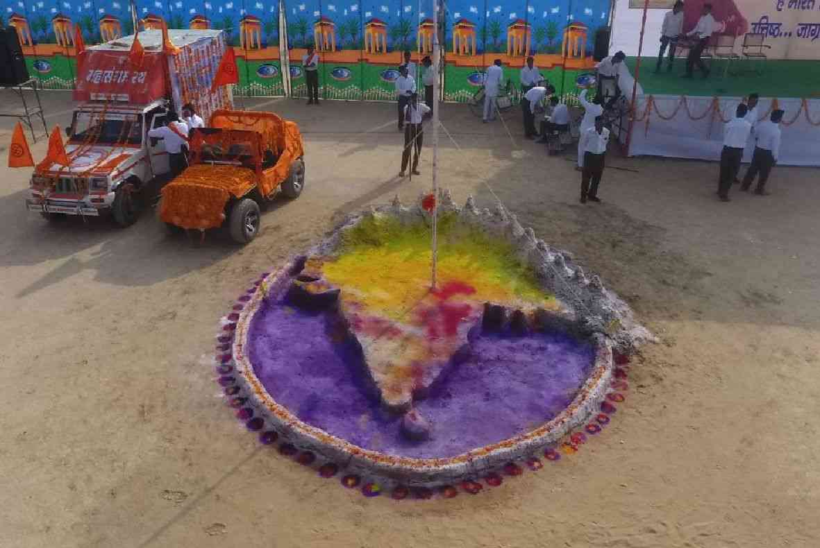 मोहनगढ़ में शुक्रवार को द्विधारा में हुए पथ संचलन में एक दल आदर्श विद्या मंदिर माध्यमिक विद्यालय से रवाना हुआ जो बाभणिया पाड़ा, लोहिया पाड़ा, सुथार पाड़ा, पुष्करणा मोहल्ला होते हुए बाजार के मुख्य चौराहे पहुंचा। वहीं दूसरा दल राउप्रावि रामपुरा से रवाना होकर रामपुरा, सरदारपुरा, उपनिवेशन तहसील, सामुदायिक स्वास्थ्य केंद्र होते हुए मुख्य बाजार पहुंचा। दानों दलों के मुख्य चौराहे पर पहुंचने पर ग्रामीणों ने फूलों की बरसात की। महिलाएं व बालिकाएं सिर पर कलश धारण कर पथ संचलन के साथ ही धर्म सभा स्थल पहुंची। इसमें गणवेश धारी स्वयं सेवकों के अलावा ग्रामीण महिलाएं व पुरुष भी उपस्थित रहे। इस दौरान इंन्द्रसिंह जिला प्रचारक, भगवतदान जिला कार्यवाह, शैतानसिंह राठौड़ विधायक पोकरण, जेठूसिंह जिला बोद्धिक प्रमुख, कमल किशोर जिला शारीरिक प्रमुख, हनुमानसिंह महाविद्यालय प्रचारक, लालूसिंह सोढ़ा विभाग संयोजक बजरंग दल सहित विश्व हिन्दू परिषद्, सीमाजन कल्याण समिति के कार्यकर्ता उपस्थित रहे।