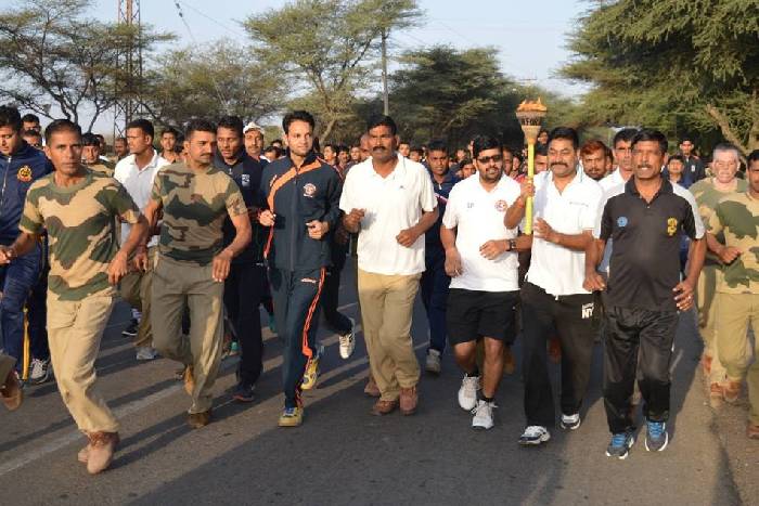 जैसलमेर. राजस्थान स्थापना दिवस समरोह- 2017 के कार्यक्रमों की कड़ी में जैसलमेर जिला मुख्यालय पर इन्दिरा इन्डोर स्टेडियम से ‘रन फोर राजस्थान मैराथन मशाल दौड़’ आयोजित हुई। जिला कलक्टर मातादीन शर्मा, पुलिस अधीक्षक गौरव यादव ने मशाल को प्रज्ज्वलित किया। जिला प्रमुख अंजना मेघवाल व नगरपरिषद सभापति कविता खत्री ने मैराथन मशाल दौड़ को हरी झण्डी दिखाकर रवाना किया। इस अवसर पर अतिरिक्त जिला कलक्टर केएल स्वामी, भाजपा जिलाध्यक्ष जुगलकिशोर व्यास, हिम्मताराम चौधरी, बाल कल्याण समिति के सदस्य मांगीलाल के साथ ही जिलाधिकारी एवं संभागी उपस्थित थे। स्टेडियम से इस मशाल को लेकर जिला कलक्टर शर्मा, पुलिस अधीक्षक यादव, जिला प्रमुख अंजना, नगरपरिषद सभापति कविता, भाजपा जिलाध्यक्ष व्यास, हिम्मताराम चौधरी के साथ ही नगरपरिषद आयुक्त राजीव कश्यप, खेल अधिकारी लक्ष्मणसिंह तंवर, श्रम कल्याण अधिकारी भवानी प्रताप चारण, सहायक पर्यटन अधिकारी खेमेन्द्रसिंह जाम, कोच राकेश विश्नोई के साथ ही जिला बास्केट बॉल अकादमी जैसलमेर के खिलाडी, पुलिसकर्मी, सीमा सुरक्षा बल 103 व 116 के अधिकारी एवं जवान, एएनएम प्रशिक्षणार्थी एवं अन्य संभागी दौडते हुए उत्साह के साथ रवाना हुए। जिला कलक्टर ने राजस्थान स्थापना दिवस पर सभी को बधाई दी एवं कहा कि इस दौड़ का मुख्य उद्देश्य राजस्थान के विकास में सभी को एकता दिखानी है और प्रदेश को अग्रणीय प्रदेशों की पंक्ति में लाना है। होटल पदाधिकारी मशाल लेकर सीमा सुरक्षा बल की 103 बटालियन तक पंहुचे, जहां पर सीमा सुरक्षा बल के अधिकारी मशाल को लेकर दौडते हुए पुलिस लाईन तक पंहुचे। पुलिस लाईन पर पुलिस कर्मियों ने मशाल को प्राप्त किया दौड़ते हुए विजय स्तम्भ चौराहे पर पंहुंचे, जहां पर मूमल टूरिस्ट बंगलों के पदाधिकारियों एवं सार्वजनिक निर्माण विभाग के अधिकारियों ने मशाल को प्राप्त कर कलेक्टर कार्यालय पहुंचे। यहां अतिरिक्त जिला कलक्टर स्वामी, उपखंड अधिकारी रणसिंह, तहसीलदार वीरेन्द्रसिंह भाटी ने मशाल अपने हाथों में ली एवं अमर शहीद सागरमल गोपा राजकीय उच्च माध्यमिक विद्यालय पहुंचे, जहां पर जिला शिक्षा अधिकारी माध्यमिक मनीराम मीणा, मुख्य चिकित्सा एवं स्वास्थ्य अधिकारी डॉएनआर नायक ने एएनएम प्रशिक्षणार्थियों के साथ मशाल को लेकर हनुमान चौराहा तक पहुंचे। यहां से मशाल दौड़ शहर के विभिन्न मार्गों से होते हुए नगरपरिषद के चुंगी नाका पहुंची।