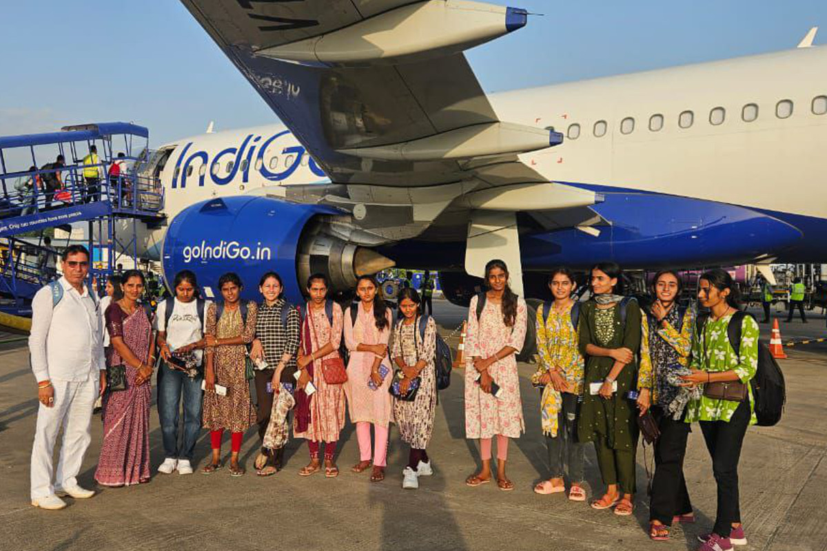 अहमदाबाद एयरपोर्ट से गोवा के शैक्षिक भ्रमण के लिए रवाना होतीं छात्राएं। फोटो- पत्रिका