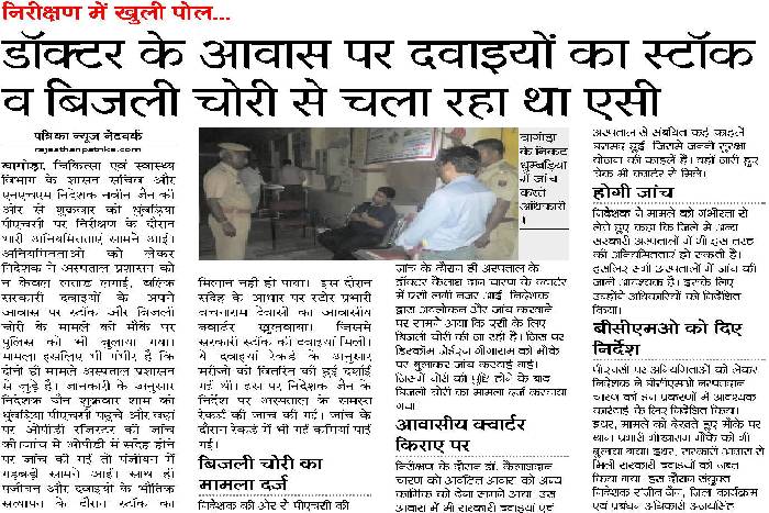 बागोड़ा. धुंबडिय़ा के प्राथमिक स्वास्थ्य केंद्र में शुक्रवार को चिकित्सा एवं स्वास्थ्य विभाग के शासन सचिव नवीन जैन द्वारा निरीक्षण के दौरान मिली अनियमितता के बाद विभाग शनिवार को हरकत में आया। इस मामले में जांच के लिए जहां जालोर से चिकित्सा विभाग की टीम धुंबडिय़ा पहुंची। वहीं एसीबी जालोर की टीम भी रेड कर दस्तावेज कब्जे में लिए। इधर, शाम को जालोर से पहुंची मेडिकल टीम ने अस्पताल के रेकर्ड की जांच शुरू की। इससे पूर्व शुक्रवार को निरीक्षण के दौरान भारी अनियमितताएं पाई गई थी।अनियमितताएं पाए जाने पर रिकॉर्ड जब्त कर लिए गए साथ ही देर रात को हुई कार्रवाई के बाद डॉक्टर के आवास को एनएचएम निदेशक जैन के निर्देश पर टीम ने आवास को सील कर दिया।निदेशक जैन के निर्देशन पर ब्लॉक उप मुख्य चिकित्सा एवं स्वास्थ्य अधिकारी डॉक्टर नरपत दान चारण ने दवाइयों का दुरुपयोग एवं सरकारी संपत्ति को नुकसान पहुंचाने को लेकर प्रभारी कंपाउंडर वचनाराम देवासी के विरुद्ध देर रात को बागोड़ा पुलिस थाने में मामला दर्ज कराया।