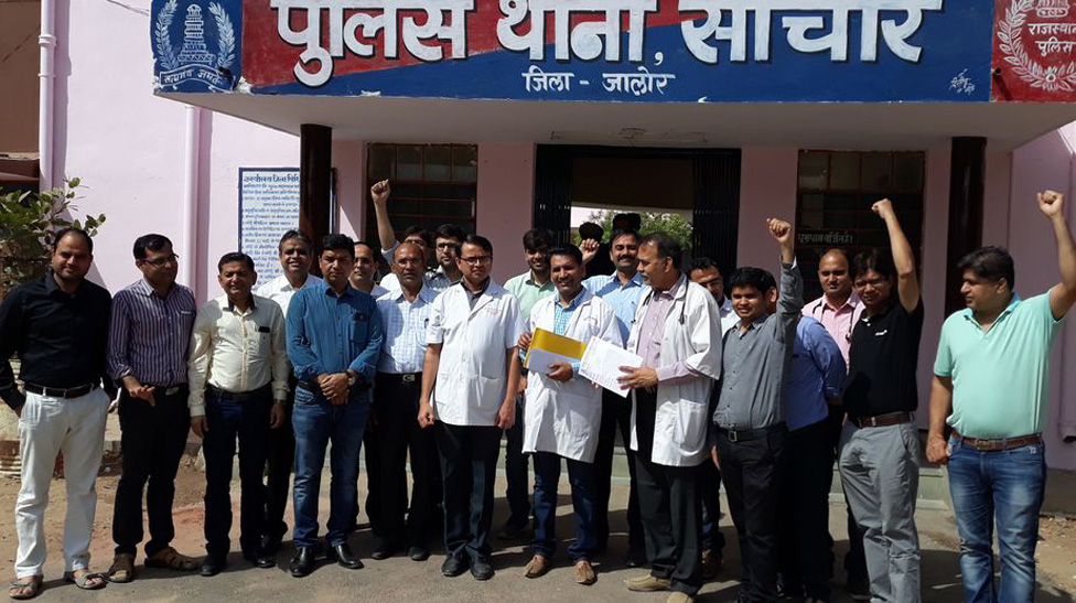 साचौर. इंडियन मेडिकल एसोसिएशन के तत्वावधान में गुरूवार को निजी अस्पताल के चिकित्सकों ने एसोसिएशन अध्यक्ष डॉ. गोपीकिशन बिश्नोई के नेतृत्व में पुलिस थाने पहुंचकर सिवाड़ा सरपंच दुर्गाराम बिश्नोई की ओर से शिशु रोग विशेषज्ञ डॉ. गुमान आर बिश्नोई को धमकाने के मामले में कार्रवाई की मांग की। इस दौरान चिकित्सकों ने आरोप लगाया कि सरपंच की ओर से निशुल्क इलाज करवाने की बात कहते हुए अस्पताल में धमकी देकर कार्य में बाधा पहुंचाई। ज्ञापन में बताया कि सरपंच दुर्गाराम ने ग्राम पंचायत की ओर से 15 मार्च 2018 को धमकी भरा पत्र लिखकर चिकित्सक को सिवाड़ा में उपस्थिति देने का फरमान जारी किया। वहीं उपस्थित होने पर एक तरफा कार्रवाई की चेतावनी दी है। चिकित्सकों ने ज्ञापन में आरेाप लगाया कि सरपंच पूर्व में भी इस प्रकार की घटनाएं कर चुका है। उन्होंने दोषी सरंपच के खिलाफ कार्रवाई की मांग की। इस दौरान एसोसिएशन के चिकित्सकों ने थाना प्रभारी सहित पुलिस अधिकारियों से भी मुलाकात कर कार्रवाई की मांग की। वहीं मामले में कार्रवाई नहीं होने पर सामूहिक रूप से हड़ताल पर जाने की चेतावनी दी। इस दौरान डॉ. बाबूलाल बिश्नोई, डॉ. सुरेश सागर, डॉ. चरणसिंह, डॉ. मानाराम बिश्नोई, डॉ. नरसीराम देवासी, डॉ. अशोक तलेसरा, डॉ. रघुनाथ बिश्नोई, डॉ. वीडी जोशी, डॉ. ओपी बिश्नोई, डॉ. मनोज त्यागी, डॉ. भवानीसिंह, डॉ. मनोज गंगवानी, डॉ. सुभाष सैनी, डॉ. राजूराम बिश्नोई व डॉ. गणपत चौधरी सहित कई जने मौजूद थे।