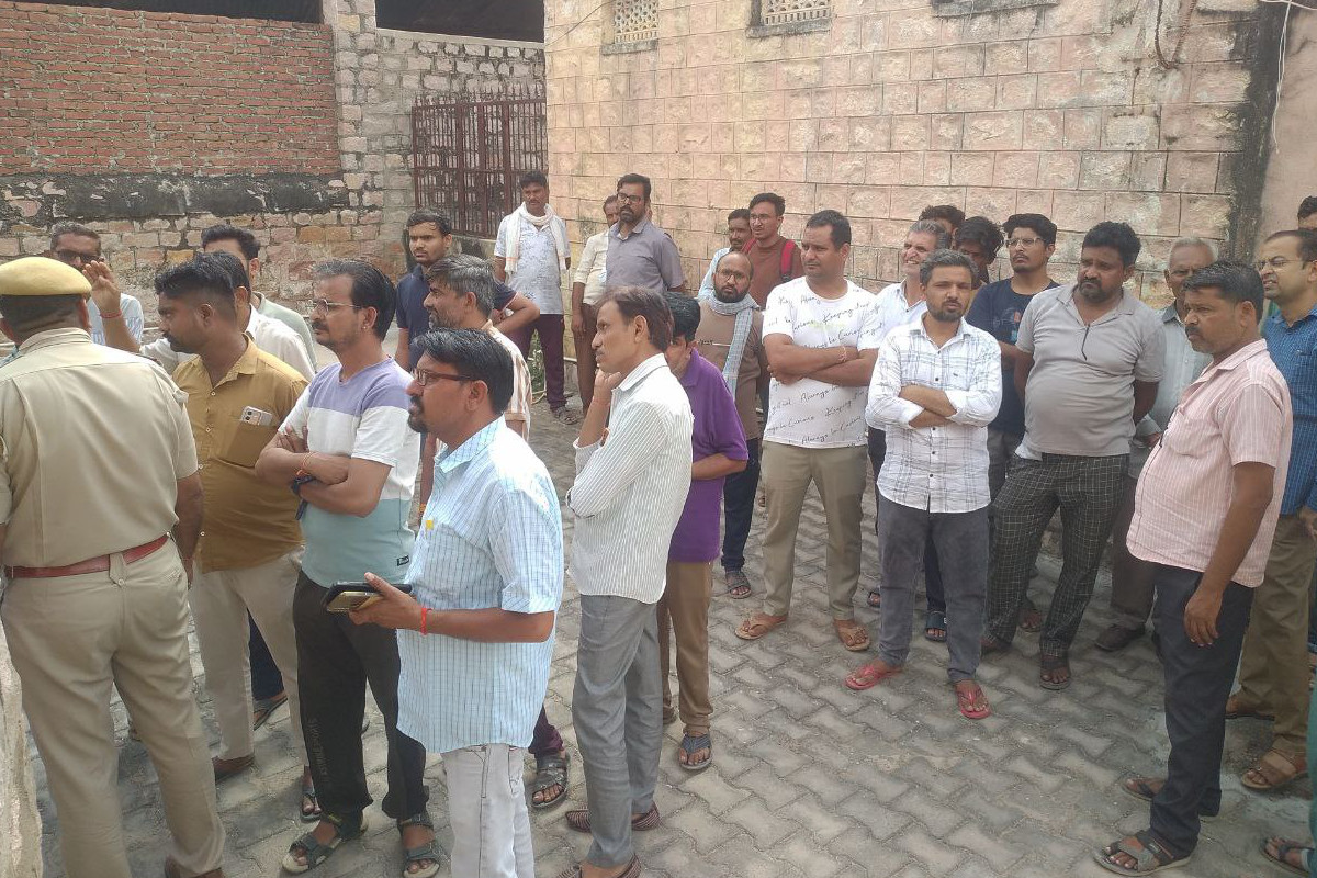 मोर्चरी के पास जमा परिवार व समाज के लोग। फोटो- पत्रिका