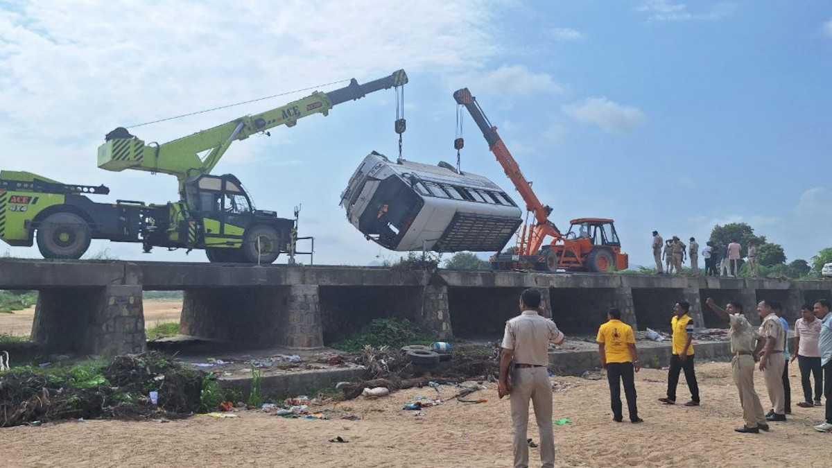 जालोर। जालोर से सुमेरपुर रूट पर चलने वाली एक निजी बस जवाई नदी में सांकरना से पहले पुल से पलट गई। हादसे के दौरान बस में 25 से अधिक सवारियां बताई जा रही है। हादसा सुबह करीब 8.15 बजे हुआ। घटनाक्रम में 12 घायल हुए, जिसमें एक को गंभीर चोटें आई। सूचना के बाद एसपी ज्ञानचद्र यादव और प्रशासनिक अधिकारी मौके पर पहुंचे। हादसे के करीब 2.30 घंटे बाद दो क्रेन की सहायता से बस को लिफ्ट कर नदी से बाहर निकाला जा सका।