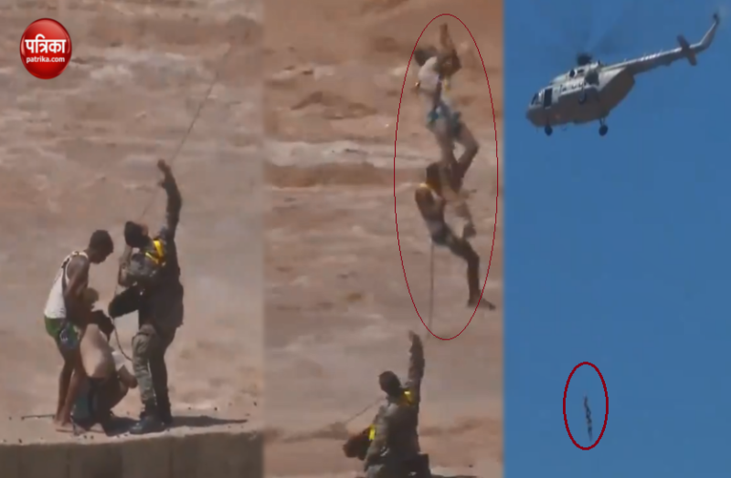 (जम्मू): जम्मू संभाग के पहाड़ी इलाकों में हो रही बारिश के कारण तवी नदी में अचानक आए उफान में सोमवार को चार लोग फंस गए। जान बचाने के लिए एयरफोर्स ( IAF ) के जवानों को बुलाया गया। एयरफोर्स के जवानों का पहला प्रयास असफल रहा। तो जवान ने खुद पानी में उतरकर लोगों को बचाया। इस घटना का वीडियो सामने आया है। इसमें देखा जा सकता है कि जवान ने कैसे अपनी जान दाव पर लगाकर चारों को बचाया।