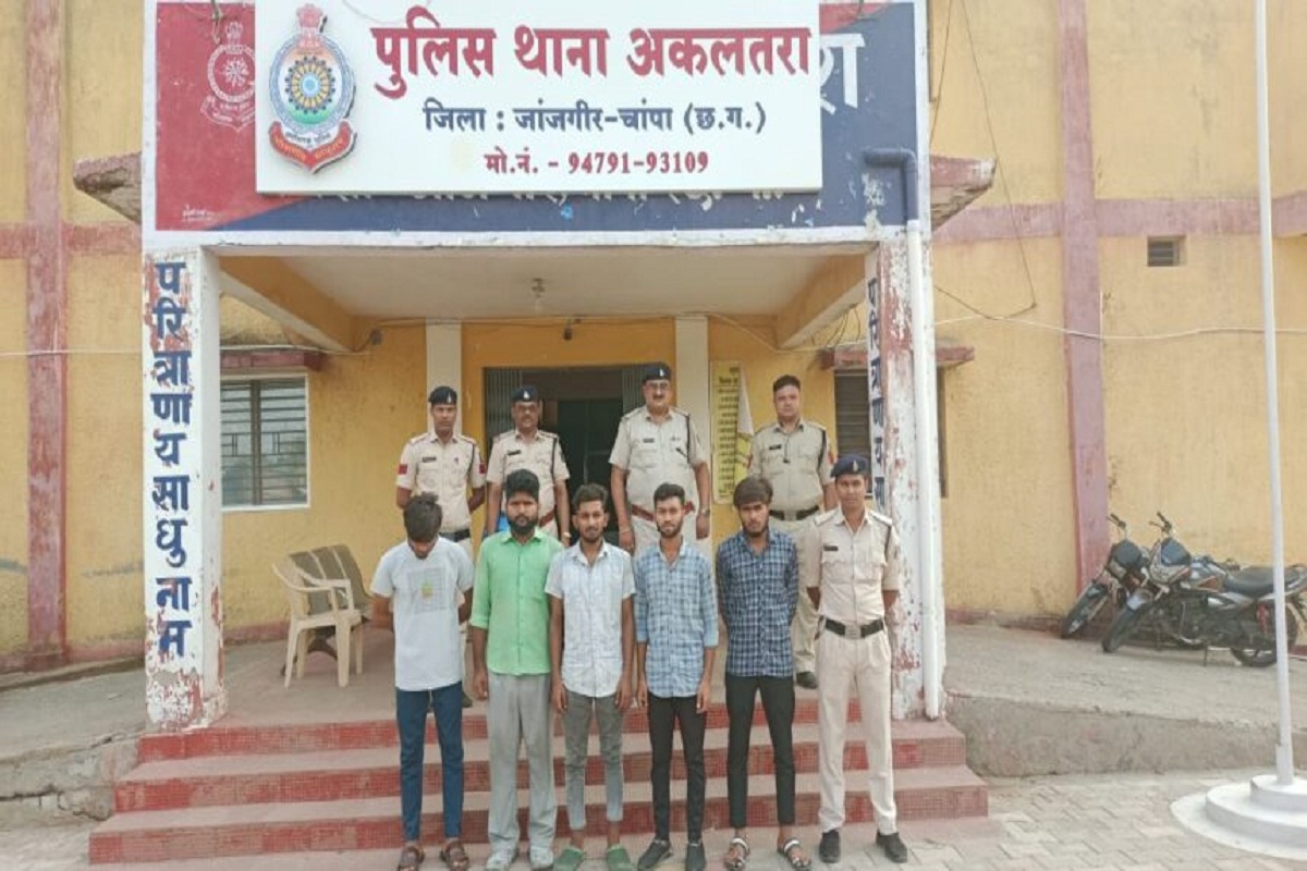 रिपोर्ट पर धारा 452, 323, 506, 427, 34 अपराध कायम कर विवेचना में लिया गया। विवेचना दौरान आरोपी अलफाज खान (19) वार्ड 11 पुरानी बस्ती अकलतरा, अमन राय (19) वार्ड नंबर 12 गुरूघासीदास मोहल्ला अकलतरा, इकबान खान (20) वार्ड नंबर 11 पुरानी बस्ती अकलतरा, अभय बर्मन उर्फ छोटू (20) वार्ड नंबर 13 कन्या शाला के पीछे अकलतरा, अमन बर्मन (20) वार्ड नंबर 13 कन्या शाला के पीछे अकलतरा को पकड़ा।
