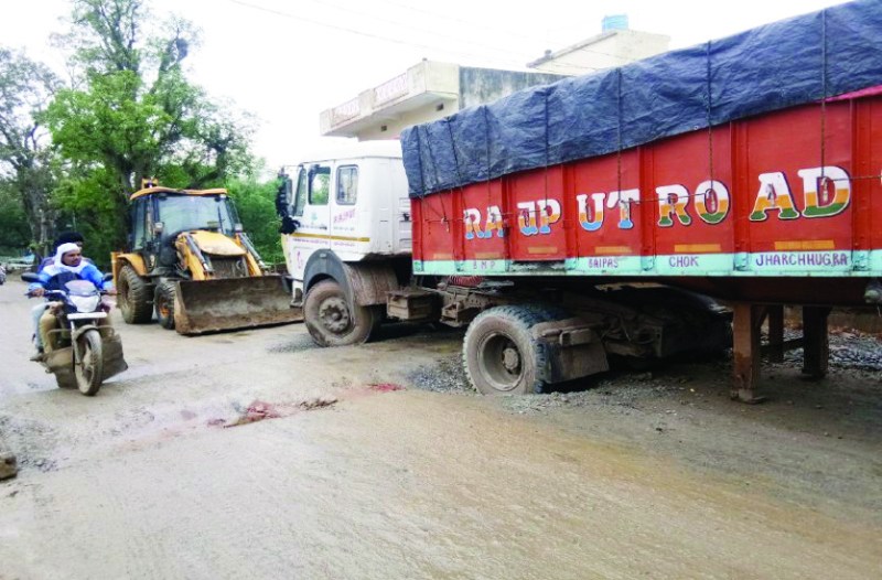 यहां मंगलवार रात एक ट्रेलर ओरआर 23 ई 7114 का पहिया बलौदा के भैंसा बाजार के पहले आईसेक्ट कंप्यूटर के सामने धंस गया और बड़ी मसक्कत से बुधवार को उसे वहां से निकाला जा सका। ट्रेलर को फंसा देखकर लोग ठेकेदार और शासन प्रशासन को कोसते रहे।