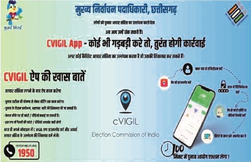 जांजगीर चांपा। CG News: स्वतंत्र और निष्पक्ष निर्वाचन सुनिश्चित करने में नागरिकों की भागीदारी और जवाबदेही बढ़ाने के लिए भारत निर्वाचन आयोग विधानसभा निर्वाचन- 2023 में भी सी-विजिल मोबाइल एप लेकर आया है। इस एप के जरिए कोई भी व्यक्ति आदर्श आचरण संहिता का उल्लंघन की गतिविधियों या घटनाओं की शिकायत चंद मिनटों में दर्ज करा सकता है। इसके लिए अब उसे निर्वाचन अधिकारी के दफ्तर में आने की जरूरत नहीं होगी। जिले में अब तक आदर्श आचार संहिता उल्लंघन की शिकायतें होने पर समय रहते कार्रवाई की जाएगी। सी-विजिल मोबाइल एप पर शिकायत प्राप्त होते हुए उड़ऩदस्ता (एफएसटी) तुरंत मौके पर पहुंच कर जरूरी कार्रवाई करेगा। इस एप के माध्यम से आने वाली हर शिकायत पर 100 मिनट के अंदर कार्रवाई की जाएगी।