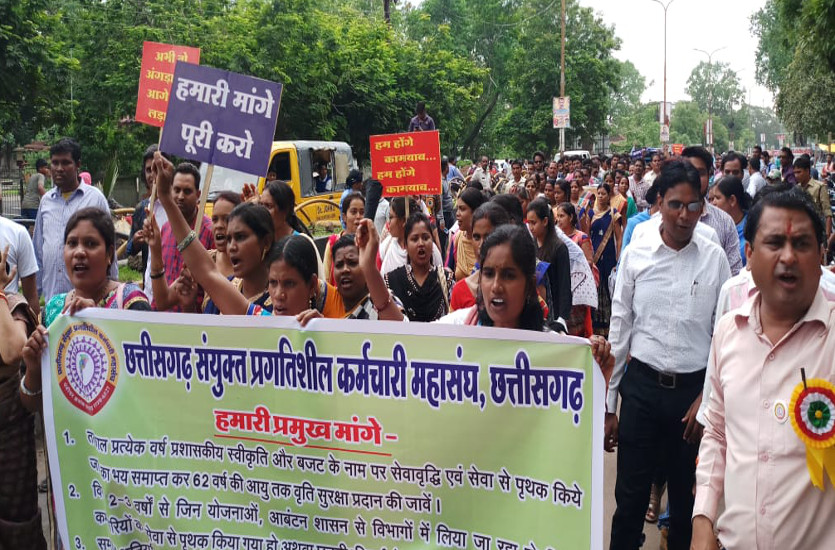 चार सूत्रीय मांग में समस्त अनियमित कर्मचारियों को नियमित किये जाने, प्रत्येक वर्ष प्रशासकीय स्वीकृति और सेवा से पृथक करने का भय समाप्त कर 62 वर्ष की आयु तक वृत्ति सुरक्षा प्रदान की जाने, विगत 2-3 वर्षो से जिन कर्मचारियों को सेवा से पृथक किया गया है या उसकी छंटनी की हो उनकी सेवा बहाल किये जाने, शासकीय सेवाओं में आउट सोर्सिग एवं ठेका प्रथा को समाप्त किया जाए और सेवारत कर्मचारियों को शासकीय सेवक का दर्जा दिया जाए व समान कार्य समान वेतन लागू किए जाने को लेकर की जा रही है।