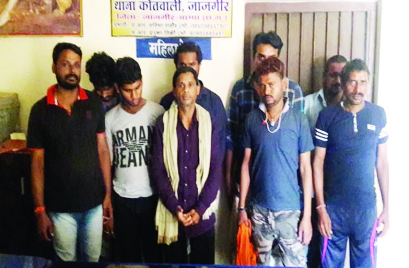 शिकायत सेल प्रभारी लंबोदर सिंह तथा थाना जांजगीर व चांपा के जवानों की टीम को भेजा गया। मौके पर चांपा निवासी अशोक उर्फ बबला पंडा द्वारा जुआ खिलाया जा रहा था। पुलिस ने बबला सहित ग्राम कोसमंदा निवासी तेरसराम साहू, अजय राठौर, भांठापारा जांजगीर के मिथलेश भारद्वाज, ग्राम खोखरा के भरत राठौर, ग्राम हथनेवरा के रामगोपाल पटेल, पुरानी बस्ती जांजगीर के उपेंद्र राठौर, कॉलेज रोड चांपा निवासी विक्रमसिंह राजपूत, राजापारा चांपा के लव देवांगन को गिरफ्तार किया।