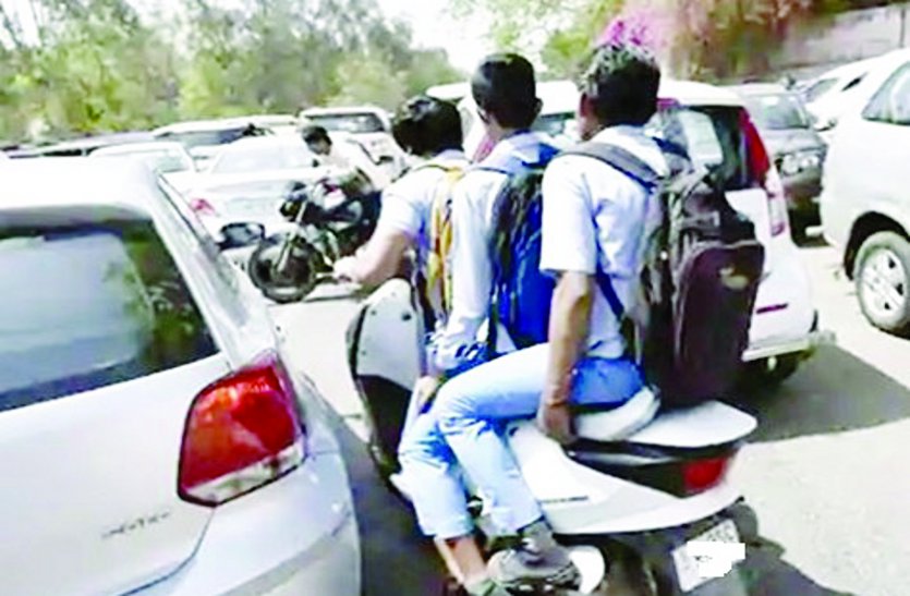 दो पहिया वाहन से स्कूल जाते नाबालिग स्कूली बच्चे।
