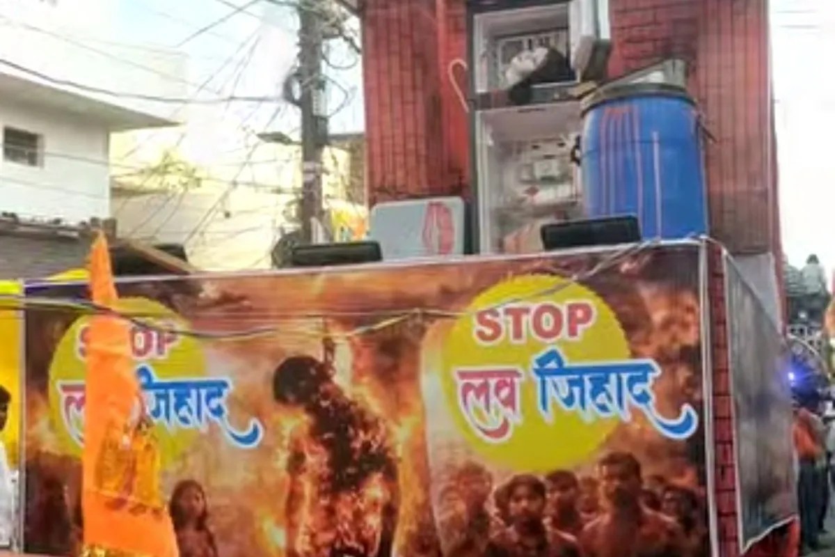 जौनपुर: रामनवमी पर खेतासराय नगर में निकल गई एक शोभायात्रा में एक झांकी चर्चा का विषय बनी रही। इस झांकी का विषय 'लव जिहाद' था, जिसमें कलाकारों ने कई नाटक प्रस्तुत किए। इस झांकी में एक फ्रिज के अंदर हिंदू लड़की दिखाई गई। इसके साथ ही नीले ड्रम वाले कांड को लेकर भी या झांकी चर्चा का विषय बनी हुई है।
