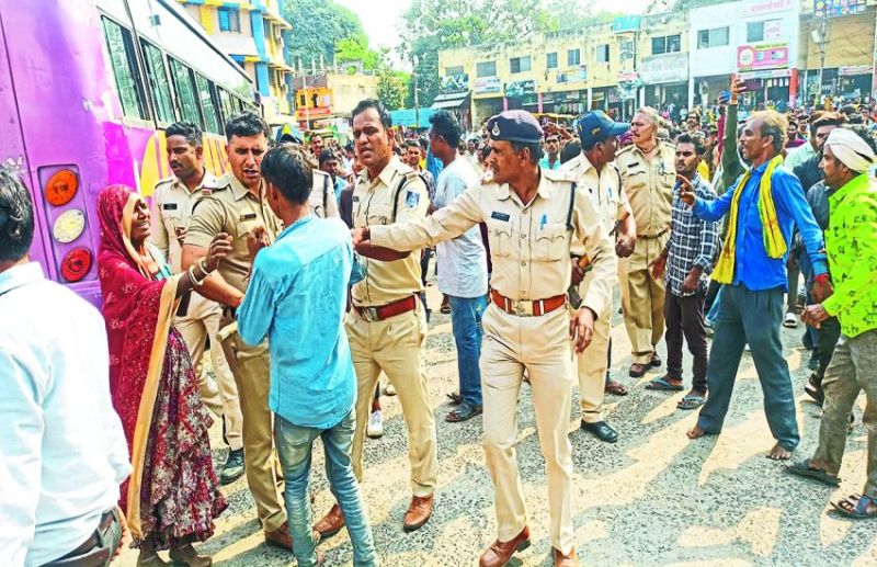हादसे की जानकारी लगने के बाद मुकेश का भाई और अन्य ग्रामीण बस स्टैंड पहुंच गए। यहां उन्होंने आते ही हंगामा शुरू कर दिया। उनका कहना था हमारे आने से पहले शव को क्यों हटाया गया। इस बात पर काफी देर तक बहस चलती रही। मृतक मुकेश की मां तो बस के आगे बैठकर रोने लगी। हालात की गंभीरता को देखते हुए एसडीओपी बबिता बामनिया भी दल बल के साथ बस स्टैंड पहुंच गई। ग्रामीण इतने ज्यादा आक्रोशित थे कि उन्होंने दो बार बस में आग लगाने का प्रयास किया। पहली बार तो मुकेश का भाई माचिस लेकर बस के अंदर घुस गया। उसे जैसे तैसे बाहर निकाला। इसी हंगामे के बीच कुछ ग्रामीण ने पत्थर और ल_ से बस के कांच भी फोड़ दिए। पुलिस हालात संभालने का प्रयास कर ही रही थी कि मृतक का भाई कहीं से पेट्रोल की केन लेकर आ गया। वह बस में आग लगाने की फिराक में था। पुलिस ने जैसे-तैसे उससे केन छीनी। इस छीना झपटी में पेट्रोल सडक़ पर ढुल गया। ऐसे में पुलिस को हल्का बल प्रयोग करना पड़ा।स्थिति की गंभीरता को देखते हुए लाइन से अतिरिक्त फोर्स बुलाना पड़ा। पुलिस बल को देखकर हंगामा कर रहे ग्रामीण तितर-बितर हो गए। इसके बाद ग्रामीणों को समझाकर जिला अस्पताल रवाना किया। जब सब चले गए तो फिर बस को हटाकर कोतवाली पहुंचाया।