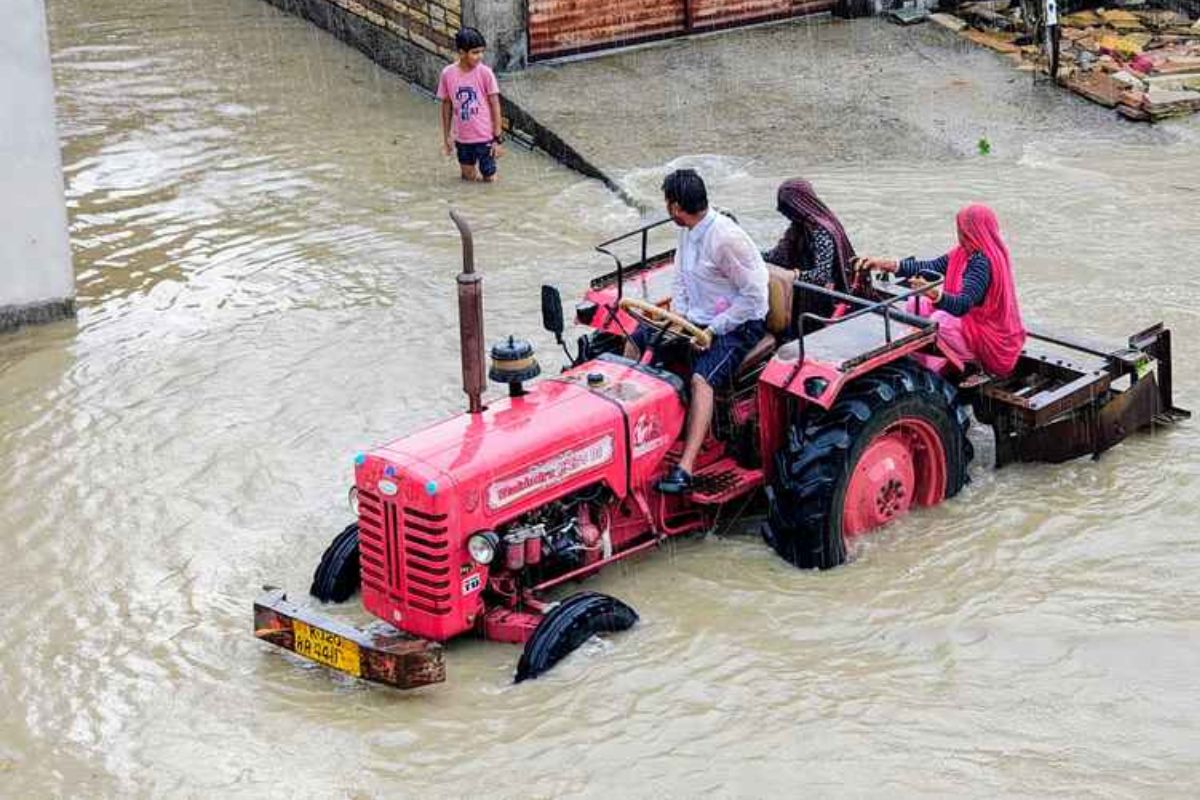 गांव समराई में सड़कों पर पानी भर जाने से लोगों को ट्रैक्टर में बिठाकर सुरक्षित घर पहुंचाते हुए (फोटो: पत्रिका)