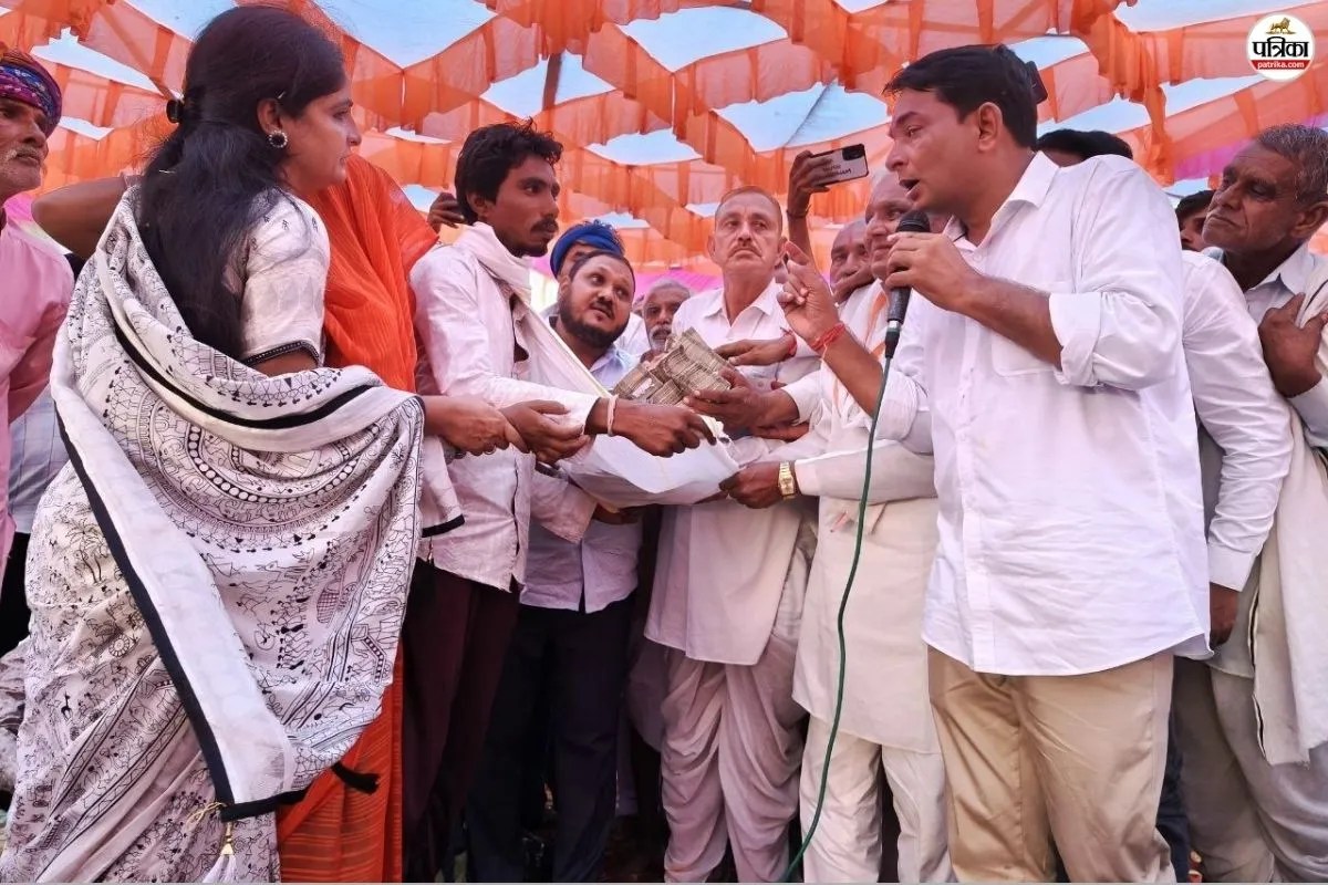 पीड़ितों को नकद राशि देते नरेश मीणा (फोटो-पत्रिका)
