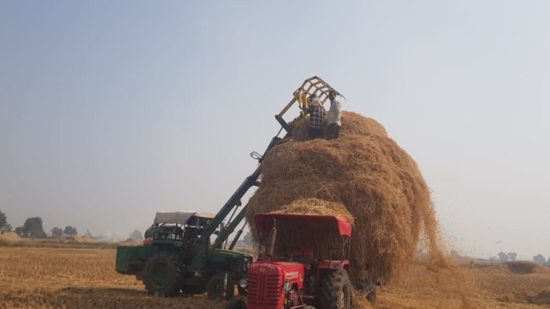पनवाड़. पशुओं के चारे के लिए धान की पराली को ट्रैक्टर-ट्राली में भरते किसान।