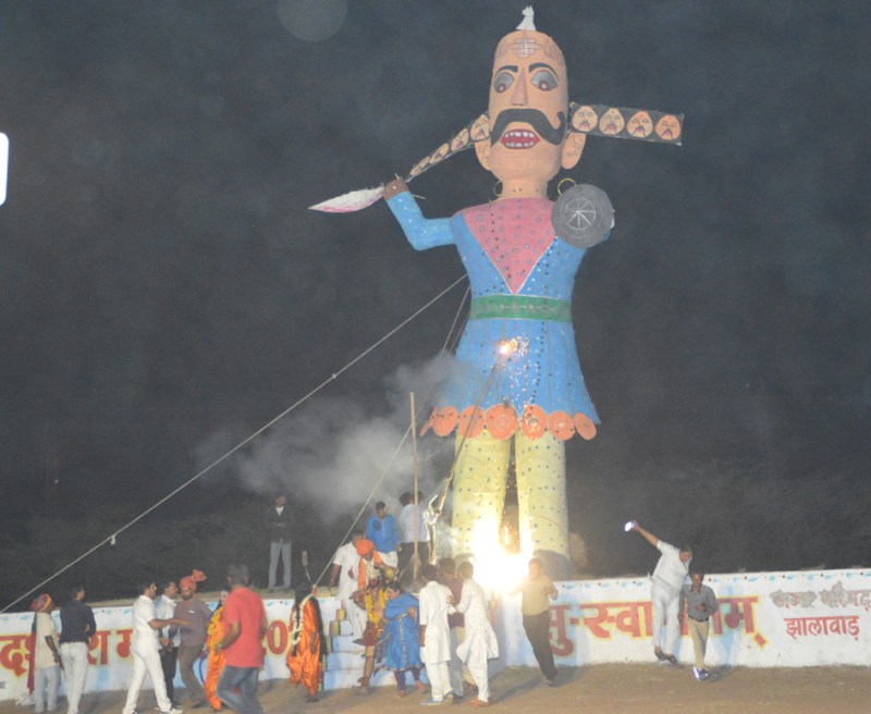 झालावाड़. चैत्र नवरात्र महोत्सव के तहत दशहरे पर सोमवार रात ठीक आठ बजे राड़ी के बालाजी मैदान पर 35 फिट के रावण के पुतले का दहन किया गया। इस दौरान शहरवासियों का दशहरा देखने के लिए सैलाब उमड़ पड़ा। कार्यक्रम में राम लक्ष्मण का वेश धरे कलाकारों ने रावण के पुतले को अग्रि के हवाले किया। इससे पहले छीपाबड़ौद के शोरगरों नौशाद भाई व भोला भाई द्वारा आकर्षण आतिशबाजी का नजारा प्रस्तुत किया गया।