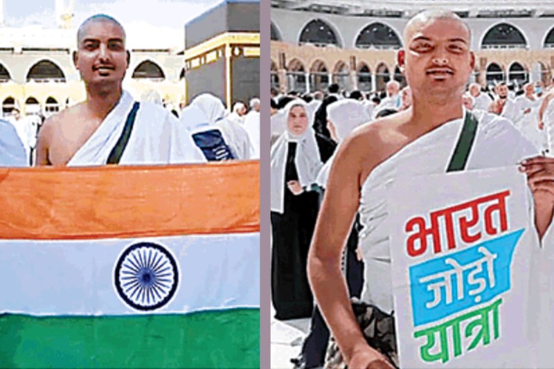 रजा कादरी काबा के सामने भारतीय झंडा एवं भारत जोड़ो यात्रा के पोस्टर के साथ।