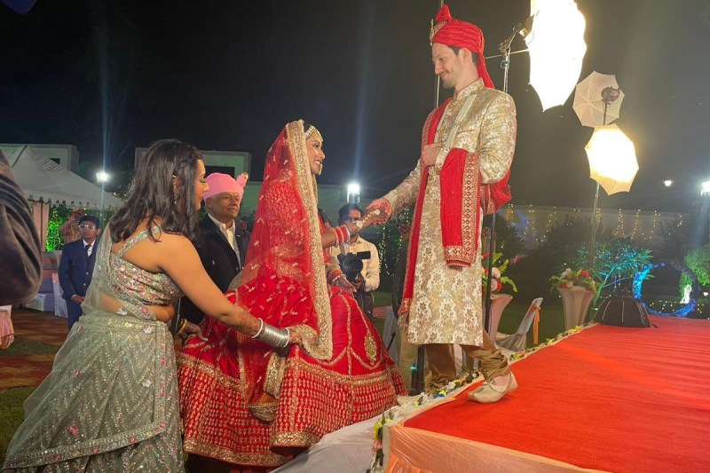 खजुराहो में मंत्रोच्चार के बीच दोनों ने सात फेरे लिए और वैदिक रीति-रिवाज के साथ विवाह संपन्न हुआ। जब विदेशी दूल्हा घोड़ी पर चढ़कर निकला तो लोगों। के लिए भी आकर्षण का केन्द्र बना। शादी की सभी रस्में हिंदू रीति रिवाज के साथ हुई।