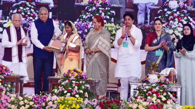 झुंझुनूं में एक महिला का सम्मान करते उप राष्ट्रपति जगदीप धनखड़।