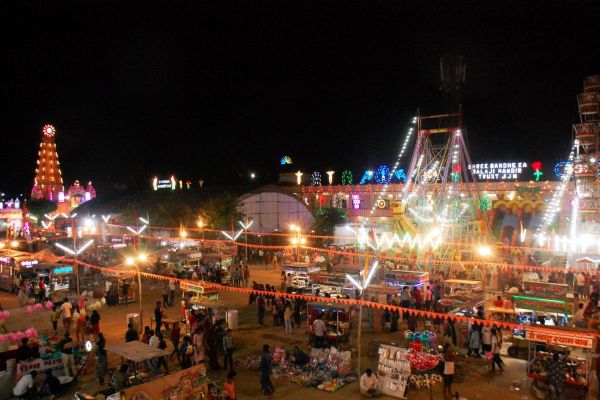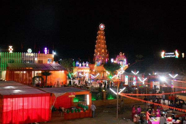 झुंझुनूं. हनुमान जयंती की पूर्व संध्या में रंग-बिरंगी रोशनी से नहाया बंधे का बालाजी मंदिर।