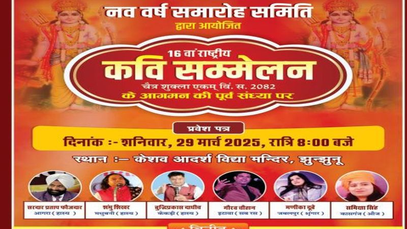 नव संवत्सर 2082 के आगमन के अवसर पर 16वां राष्ट्रीय कवि सम्मेलन शनिवार 29 मार्च को रात आठ बजे से झुंझुनूं शहर के इंदिरा नगर के केशव स्कूल के खेल मैदान में शुरू होगा। नववर्ष समारोह समिति के सचिव राजकुमार मोरवाल ने बताया कि चैत्र शुक्ला प्रतिपदा विक्रम सम्वत 2082 की पूर्व संध्या पर राणी सती मंदिर झुंझुनूं के सौजन्य से होने वाले कवि सम्मेलन की तैयारियां पूरी कर ली गई है। सम्मेलन में कवि सरदार प्रताप फोजदार आगरा, शंभु शिखर मधुबनी, बुद्धिप्रकाश दाधीच केकड़ी, गौरव चौहान इटावा, समीक्षा सिंह कासगंज व मणिका दुबे जबलपुर काव्य पाठ करेंगे।