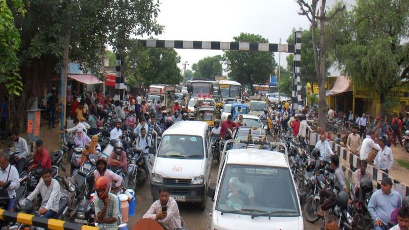 झुंझुनूं में गुढ़ा मोड़ फाटक पर जाम में फंसे वाहन।